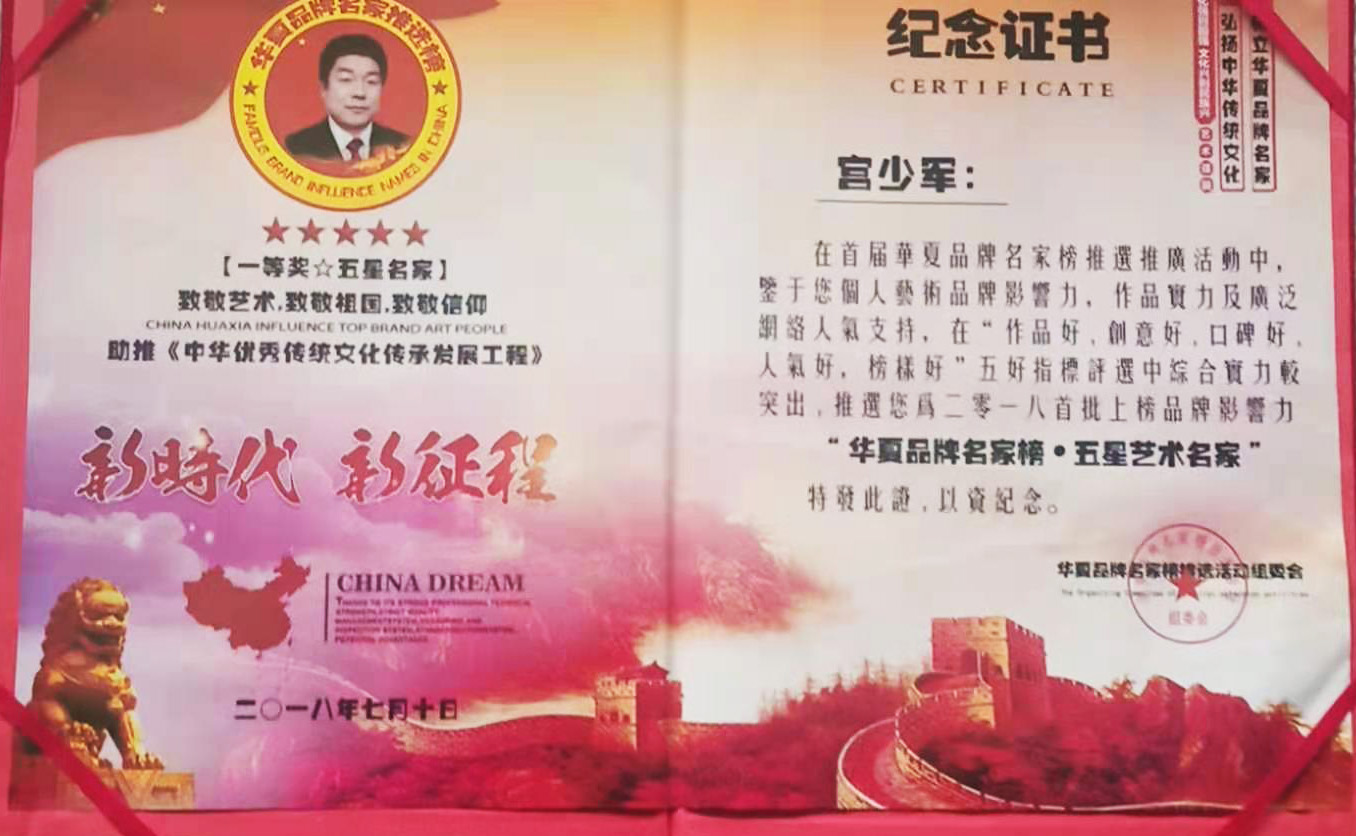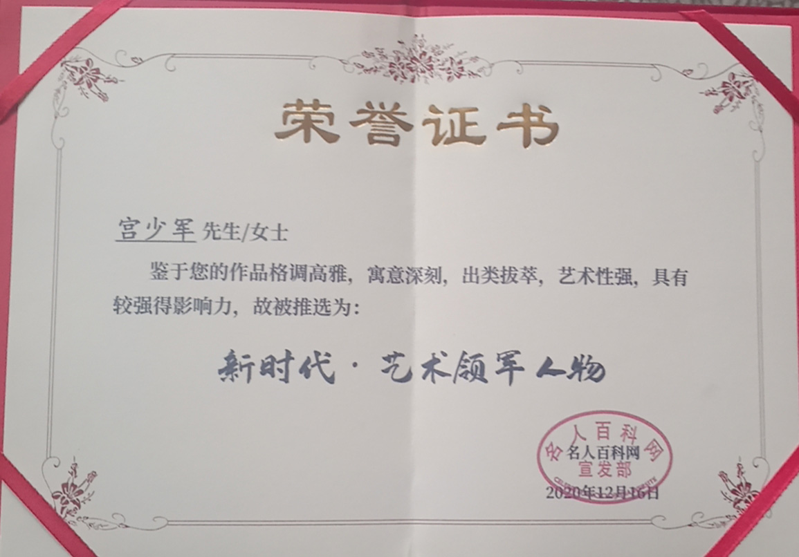 宫少军,大本学历,中共党员,国家一级美术师,青岛一墨画廊文化传媒有限公司董事长兼总经理,青岛莱西市一墨书画院发起人兼院长,是中国画坛最具潜能、最具市场收藏价值的实力派