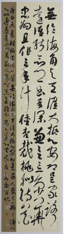 书法擅长行草书、篆书、隶书、先学唐人楷书以正间架,后学宋人行草书及上追钟鼎、甲骨、秦小篆。转学米元章在辅以苏子瞻书,稍得文气后又攻学二王一脉书法力追酒脱飘逸,使法度力品,更得慧人启发。又与汉《张迁碑》,《西狭须》《衡方碑》诸碑颇用气力,以求得之凝重朴茂,再习《痤鹤呜》、《石门领》以得萧散,遂临摹广泛,手勤手即熟,故艺事得以进展。