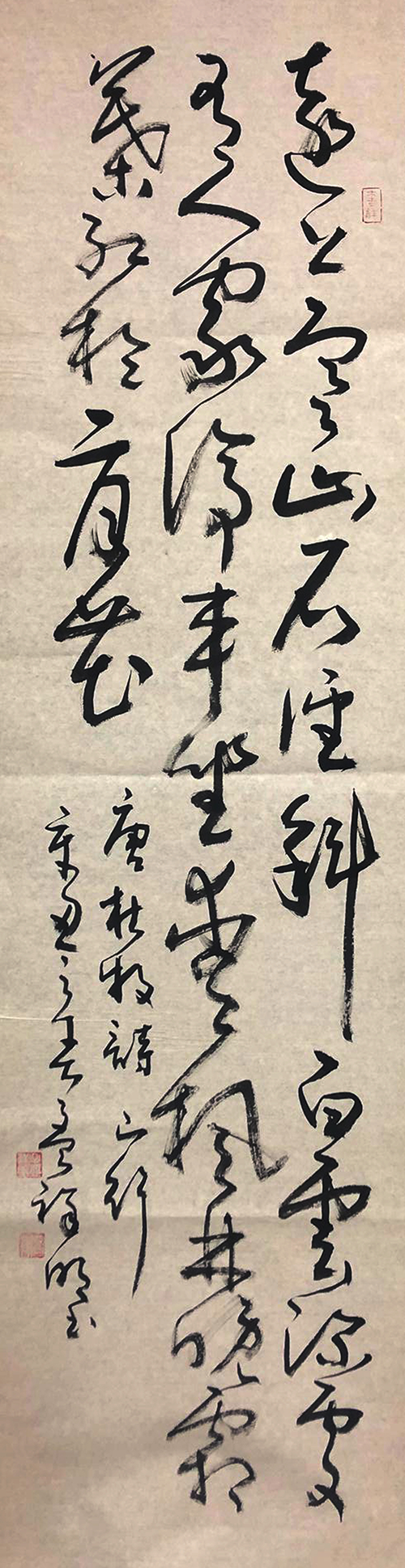 习常行草书篆隶之金石气融入草书中,通篇点画仓劲而又不失丰润。绝无纤弱浮滑之笔,尽显端庄朴拙之质,又具有飘逸秀丽之妍,如云烟霏霏,似晴空祥云,高古厚挺。