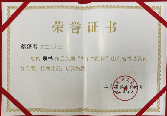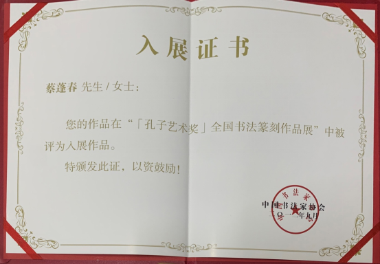 1999年获鲁迅文艺大奖,出版有:《蔡蓬春书法作品集》、《中国国学谱》、《蔡蓬春美术论》、《蔡蓬春书法论》、《蔡蓬春书画诗文集》、《蔡蓬春画集》等。其作品曾赴法国、芬兰、新加坡、日本、加拿大、法国、韩国、香港、台湾等国家和地区多次展出,中日书家作品展,中韩书法交流展,世界和平年书法展