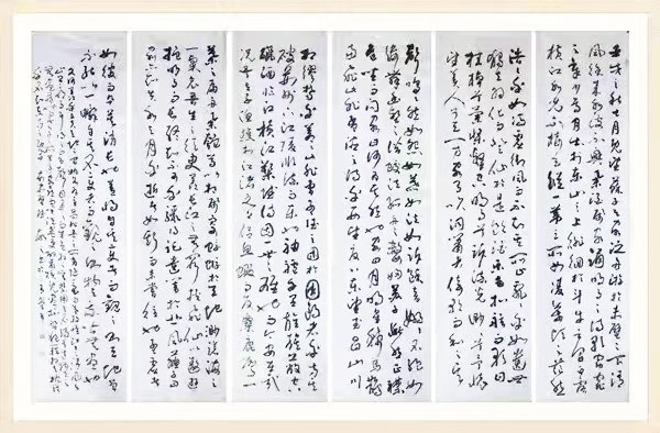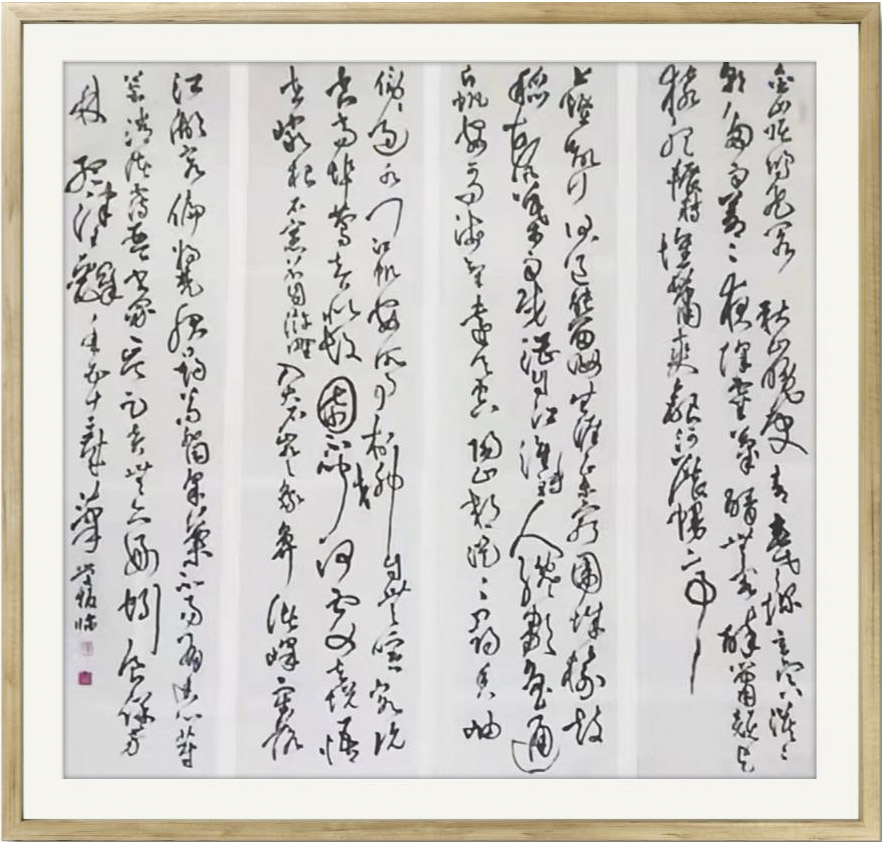 毛学校把草书、楷书、汉碑、汉隶、行草等字体集中变形,融汇于一体;同时结合大草的笔法使得作品连绵不断。其笔触,毫不拘泥概念化的规范,而是随手生发,或中或侧、或方或圆、或藏或露、或敛或纵,触处成形;其结体,则善于随形布势,或铺张排比、或敛聚收放、甚至依倚穿插,应心隐手。在具象与抽象中,展现出中国书画同源的艺术精髓;在山形云影、风帆飘动中,诠释着中国文字博大精深的象形表现力。这样的结合使文字变得有金石铁声,飘逸洒脱,大气磅礴、自然合道,宛若天成。而这种独特的书写风格,则促成并终而奠定了他在书坛坚不可摧的独立地位。