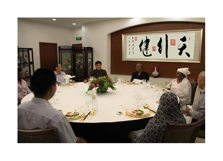 2012年尼日尔总理拉菲尼偕全家到中国驻尼日尔使馆做客,赵凯先生作品《天行健》悬挂于使馆会客厅。