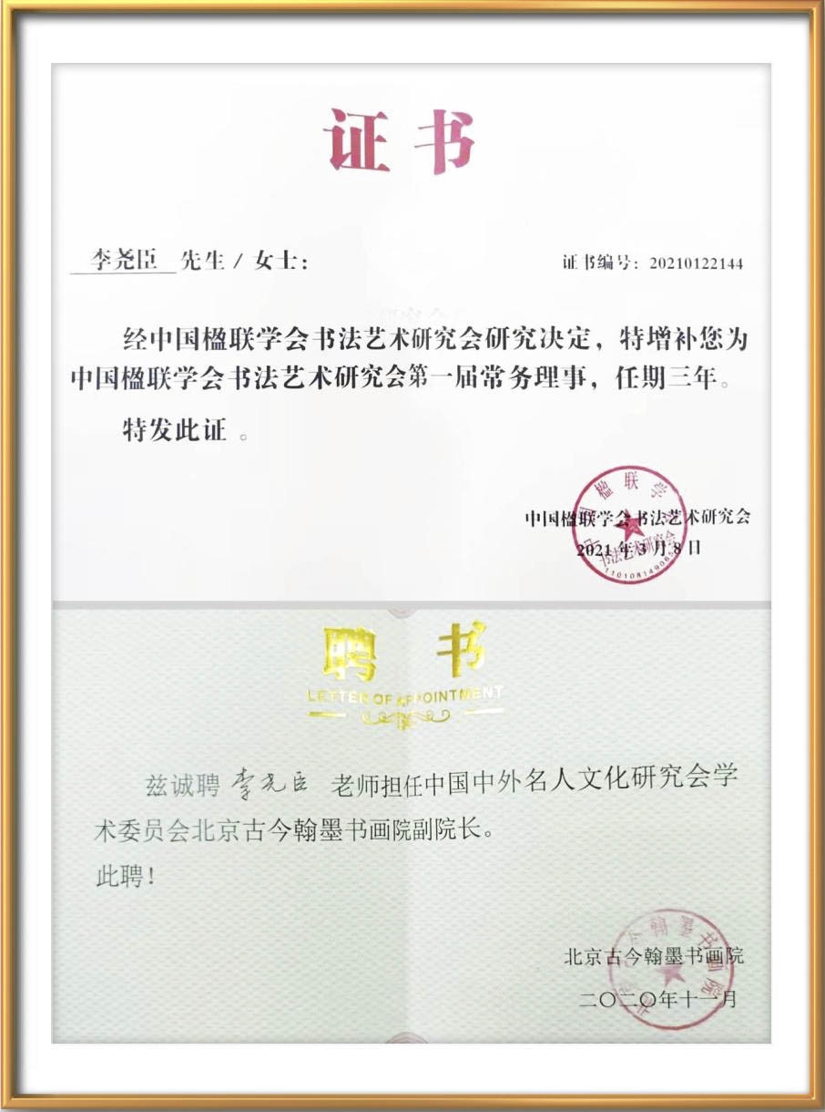 2011年,作品《国画竹雀鸣唱》《现代象形榜书》分别入编中国文联出版社出版的《当代画竹精品力作集粹》、世界艺术家协会出版的《世界艺术家名作典藏》等大型书画辞书。