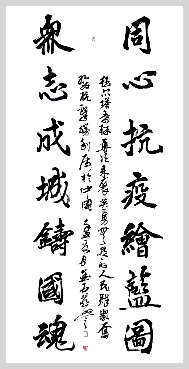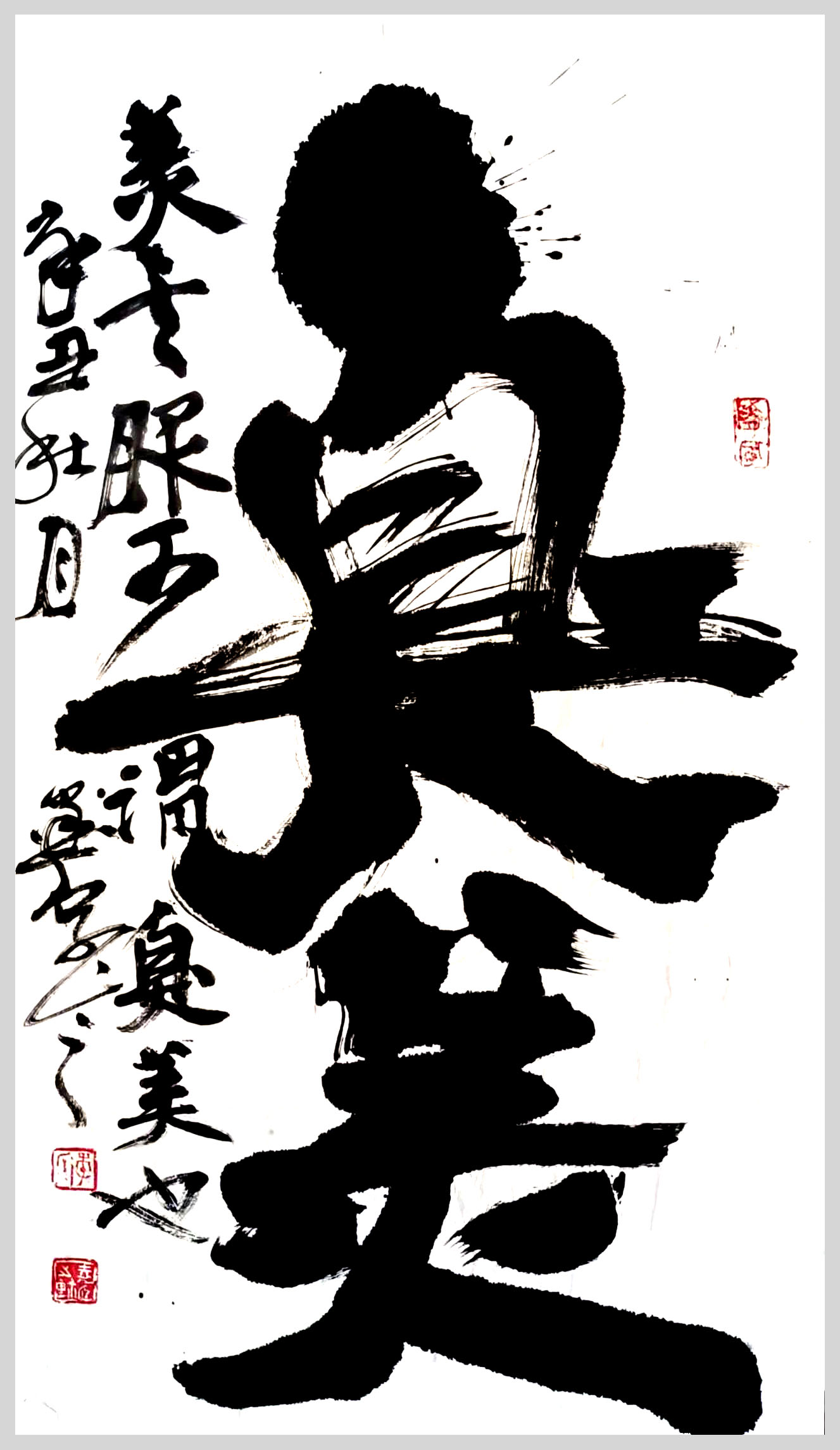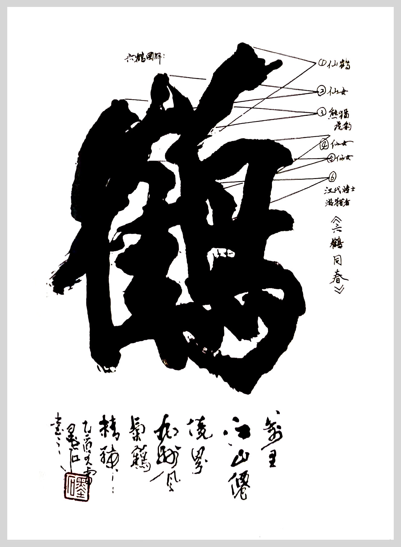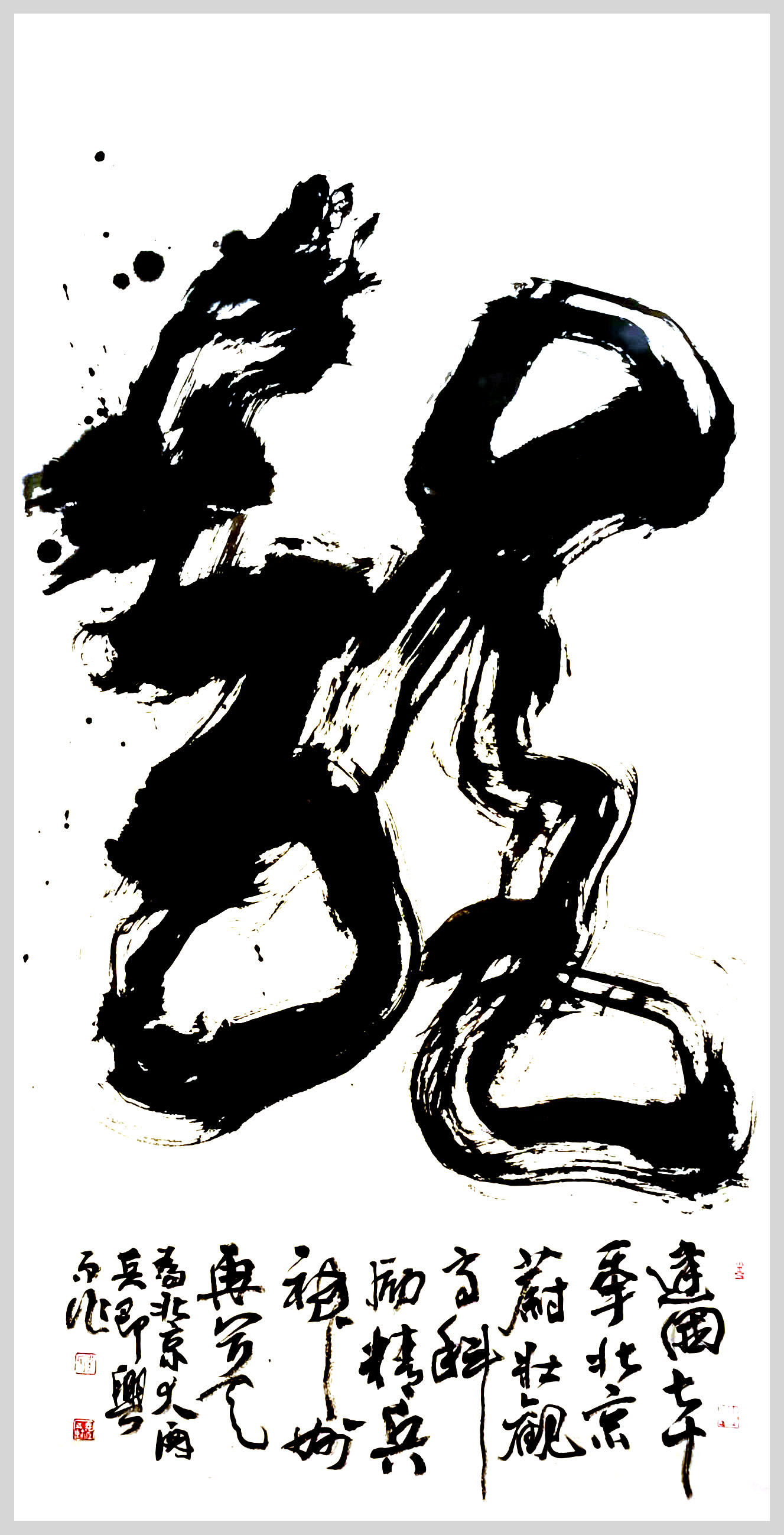 近几年,对现代象形榜书的探索有了浓厚的兴趣,深受王阔海恩师“汉画魂”的熏陶感染,以画入书,以书入画,书画并进,相得益彰,渐臻化境,实现了科学与艺术的完美结合。如榜书“龙”“鹤”“舞”“道”“博爱”“鬼手”可见一斑。