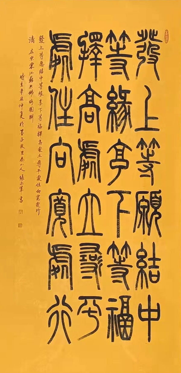 张永军,男,1962年生于山东泰安,号泰山人,中共党员,中华国礼艺术家。自幼受家庭熏陶,长辈教导,酷爱中国民族传统文化艺术,临池不辍,刻苦研习书法。1994年7月毕业于中国书画函授大学书法系,篆刻师承篆刻家、山东印社社长范正红先生;2010年参加西冷印社书法篆刻培训班,得到了孙慰祖、李刚田、崔志强、段玉鹏、范正红、燕守谷等著 名篆刻家的亲授。