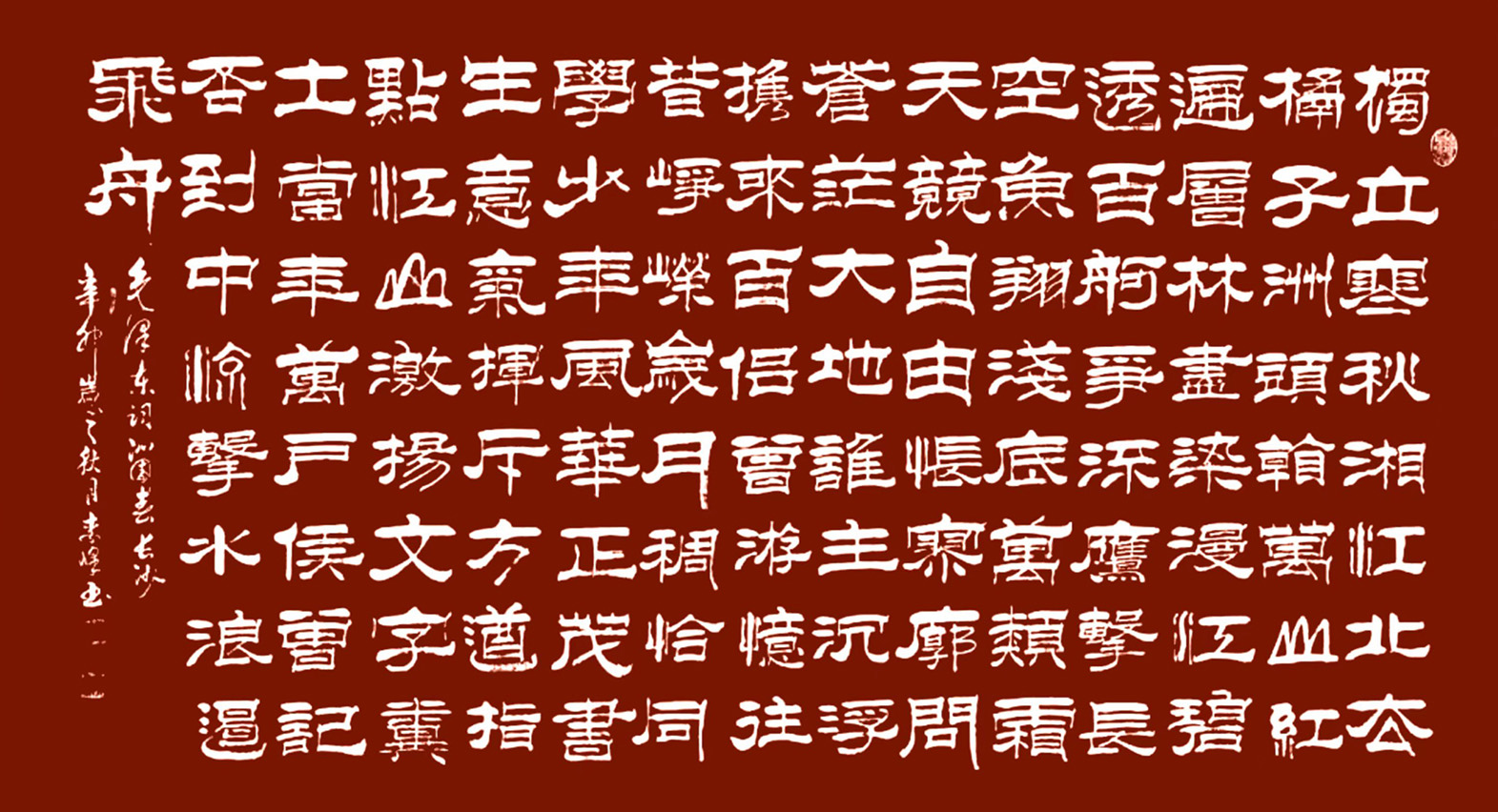 观赏他的隶书,可以非常明确地感受到,修炼隶书是把隶书从起源到隶变的整个过程都关注到位的博广,取汉帛隶书的飞动,也取汉简隶书带有篆意的高古,最终落脚于东汉隶书的碑骨精神。凡是隶碑所见,皆成隶书修养的法源,从华山碑到石门颂,从礼器碑到乙瑛碑,一一琢磨,精深探究,把隶书的苍劲品格与典雅品格进行了融会贯通,进一步把碑本隶书的“刻意”向书法隶书的“书写性”渡近,让隶书在不失筋骨的前提下,烙印出笔法飞动,极尽变化的笔墨意韵,蚕头性灵,燕尾品逸,处理点画极尽活性,如眉目,如飞鸟,如风柳,如修竹。人说天下无物非草书,他却把隶书的笔画特征也调节到天下物象尽在其中的境界,所以他的隶书是自古法来,最显时代风采的新面目,用创新之修,为隶书融进当代审美体系做出了极有价值的示范!
