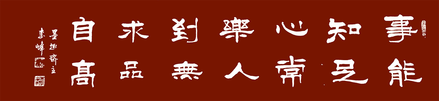 李峰,斋号:墨趣斋,自幼酷爱书法,五八年入伍后,在济南空六军任文化教员,并取得济南教师进修学院大专学历,从事专业语文和书法教学。转业后在军企工作,任经济师期间一直坚持学习书法,几十年如一日,默默无闻,勤学苦练。曾接受刘炳森、张西凡部长、王锡铭三位名师指导。擅长隶书和行书,涉猎诸家真、草、隶、篆各书体,传统功力较强。书法艺术作品普遍受到书法爱好者的赞誉和收藏。