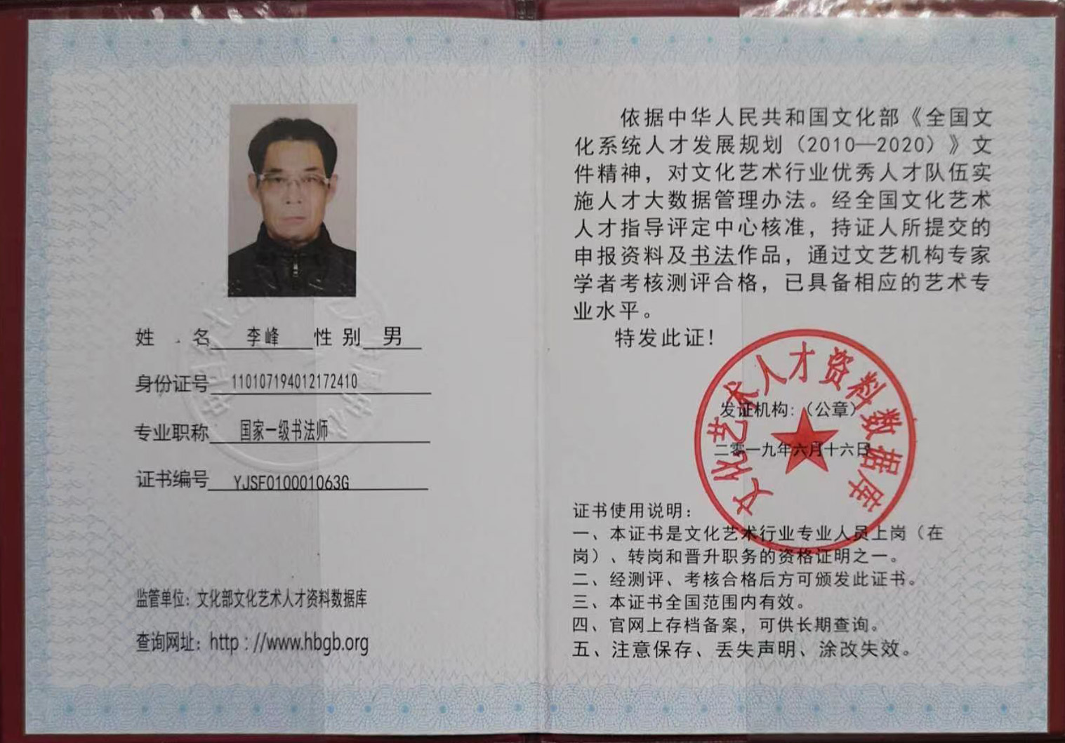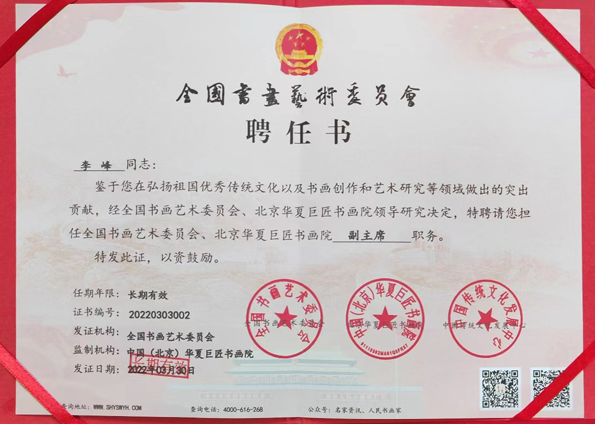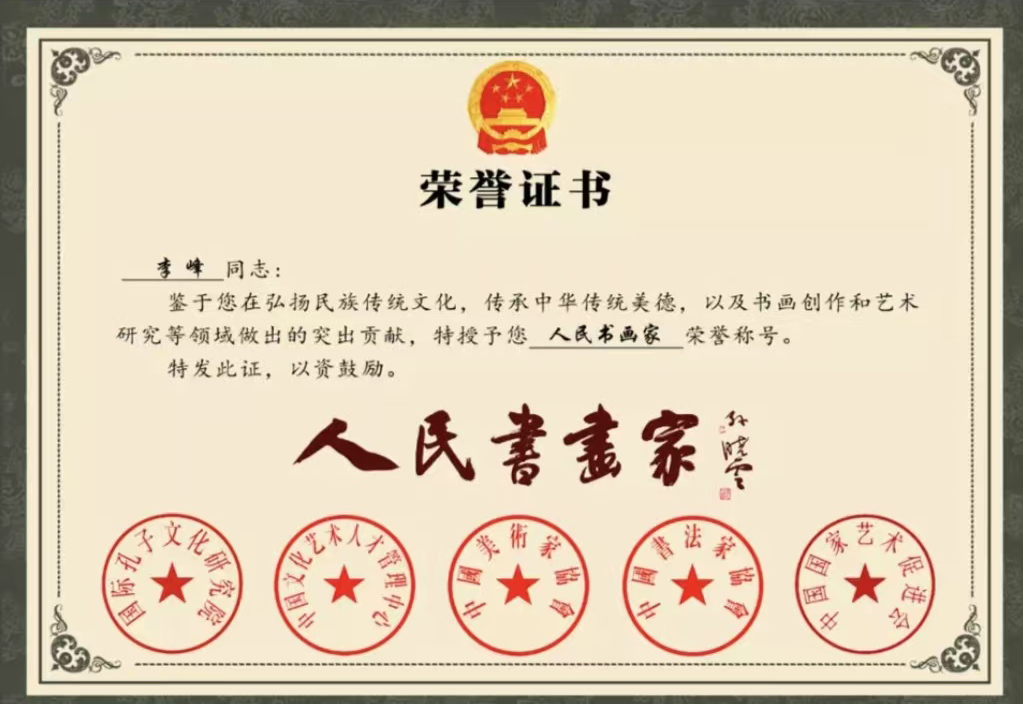 2022年被中国书法家协会,中国美术家协会,中国传统文化发展中心授予【中国人民艺术家】》荣誉称号,并颁发荣誉牌匾证书。
