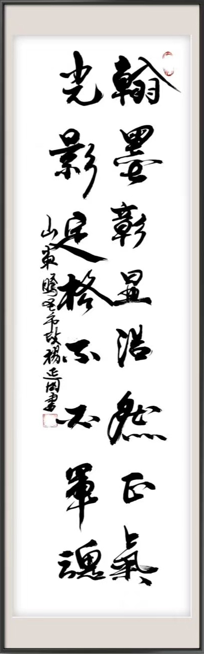 杨延国先生的书法作品之所以能在当下艺界内有树造诣,其原因也是大致可分为两方面,一方面是因为其对于传统书体法脉的深度汲取,而另一方面则是得益于他那丰富的文人品性和心迹修养。前者取法是可于作中技法彰显,行书用笔遒健而不失于盈动,墨迹亦是厚重而不失于极逸,笔墨所到之处,可谓皆是欹纵而达痛快也!结体奇正,书风浩然,气于贯通,造诣不凡!换句话说,也唯有是像杨延国先生这般具有深厚取法品修的正大书家,执笔作书才会不同于江湖书法的俗流风貌,而是有真正呈现于一种朴卓大气的臻品之境和文人气概!