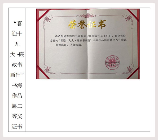 2017年作品在“喜迎十九大·廉政书画行”书画作品展被评为二等奖;