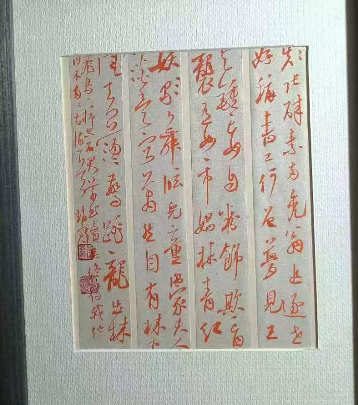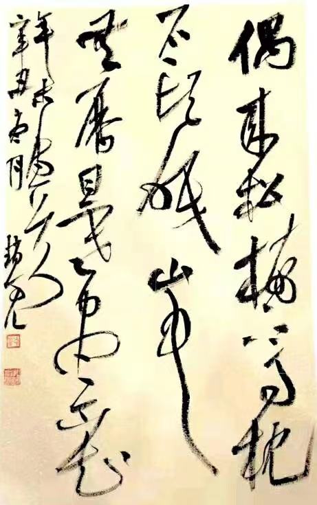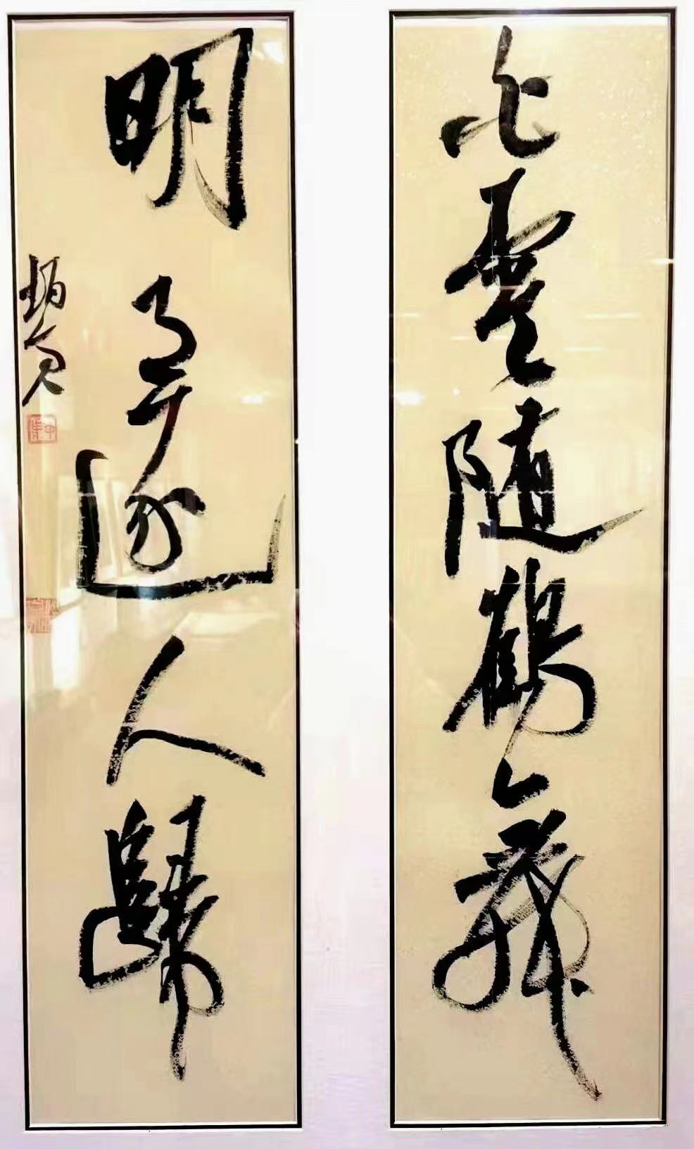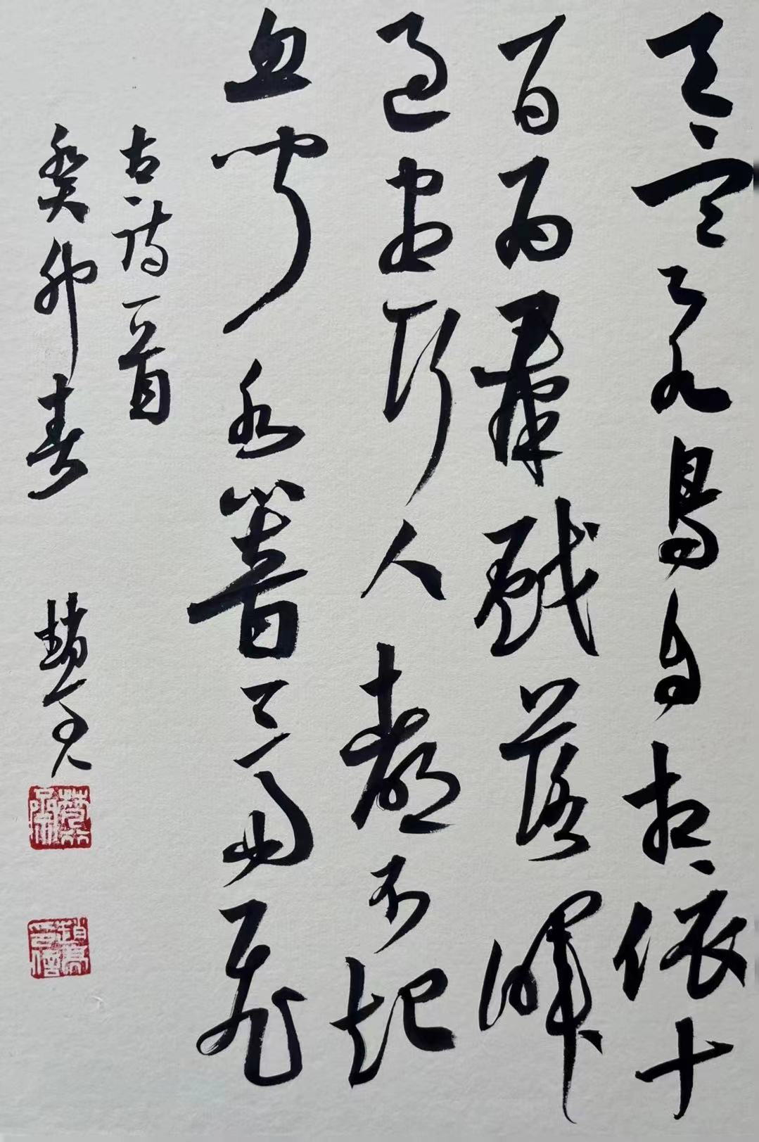 他六岁从师习艺,志宏开蒙,从唐楷入手,研习宋代书风多年,尤其精熟米字;后又问学辽西魏哲,上追唐草书风格,法张瑞图、王铎等晚明巨匠;近经乔海光启迪,潜心于张旭、怀素。数年颇有领悟,形成了开张沉雄的艺术风貌,大草初成自家体式。