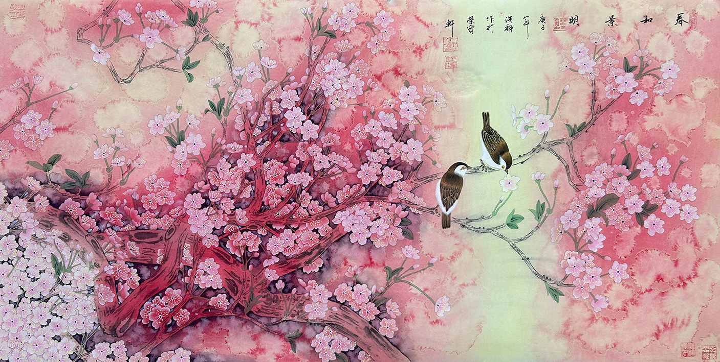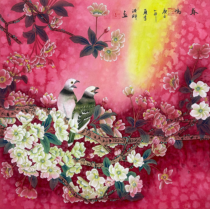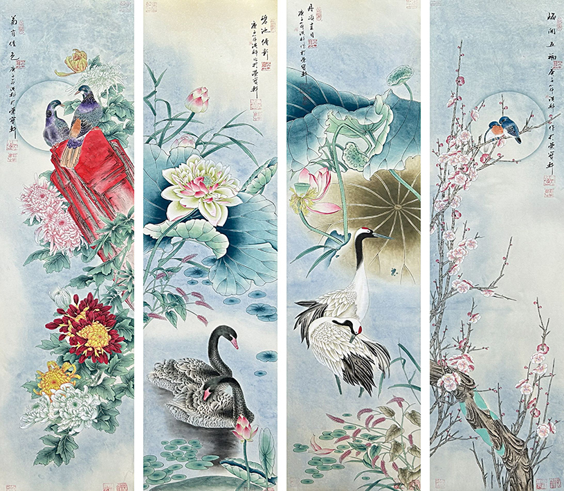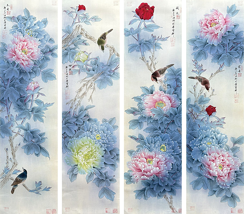就比如他的几幅牡丹四联屏作品,画中造境犹如春风和煦般和谐舒适,朵朵牡丹雍容华贵,色彩更是姹紫嫣红,时而浓艳至极,时而幽韵淡雅,实是着色象其形采,渲染得其神气也!花叶之间偃仰连络,或三两盛放,簇拥于叶群,或含苞待放,昂扬于高处,苍劲枝干穿插有力,姿态横生更见得势,由此再搭配以鸟禽栖息于其中,整幅画面便就更是能够给人带来一种唯美且宁静的自然气息,让人可以瞬间忘却俗世的纷嚣,最终在画中得到旷性怡情的心灵升华!