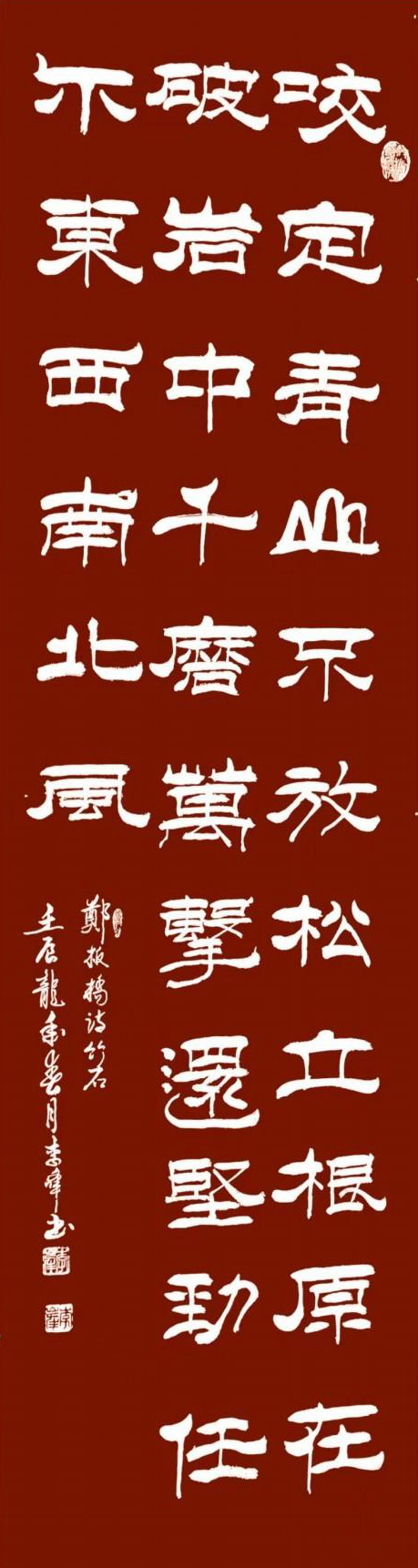 李峰,男,1940.12月,祖籍山东肥城人,斋号 : 墨趣斋,自幼酷爱书法,五八年入伍后在济南空六军任文化教员,并取得济南教师进修学院大专学历,从事专业语文和书法教学。转业后在军企工作,任经济师。期间一直坚持学习书法,几十年如一日,默默无闻,勤学苦练,曾接受刘炳森、张西凡部长、王锡铭三位名师指导,擅长隶书和行书,涉猎诸家真、草、隶、篆各书体,传统功力较强,书法艺术作品普遍受到书法爱好者的赞誉和收藏。