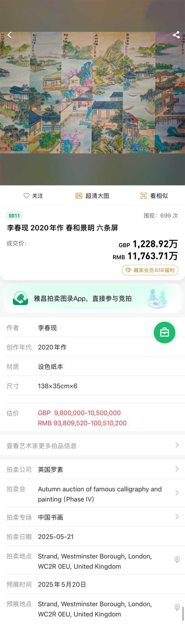 2023年11月11日,北京传世水墨拍卖有限公司举办了《2023金秋盛世》拍卖会专场。本场共上拍二百八十六件拍品。其中李春现的《一堂和气》以151万3千元起拍;经场内与电话委托的多轮叫价,最终《一堂和气》以229万元成交;足以见得李老师的作品有很大的升值空间和收藏价值!