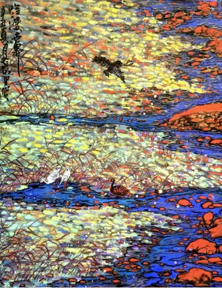 别人写生,只是写一个画面而已。甲宝先生写生却是一个世界。很多人是从技法上去学习石齐先生的“点、线、面”或“抽象、具象、印象”理论性的法度,却忽略了石齐先生“万象归一”到“万象更新”的哲学思想。甲宝的艺术世界里,“明月松间照,清泉石上流”却是一种大视觉画风,形成的万变景象。处处显示着独到的艺术风格,凡是明月照耀下的宇宙世界和想象领域,甲宝先生总会以娴熟技法和高超艺术融合的手段,将那些历史元素和现代意识有机的输入画面。他的脑海似乎就是艺术加工厂,笔下风格新颖的画面,所表达的内涵又是画家的人脑世界。穿越也罢,想象也罢,回归自然也罢,杂而不乱,乱而收心。画面的充盈,换来的是空间的无限延伸。