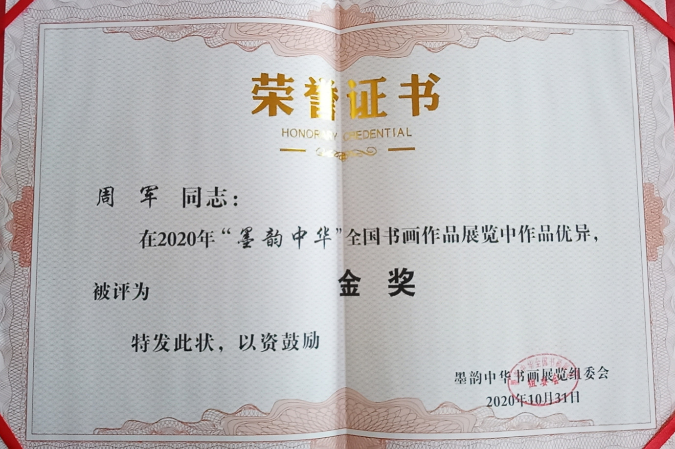 2020年参加艺巡中华光辉时代杯全国书画大赛获书法组优秀奖,同年参加全国墨韵中华杯获金奖,其书法作品人选《中华当代书画作品博览》,其优秀作品入选共和国记忆限量版珍藏邮册。