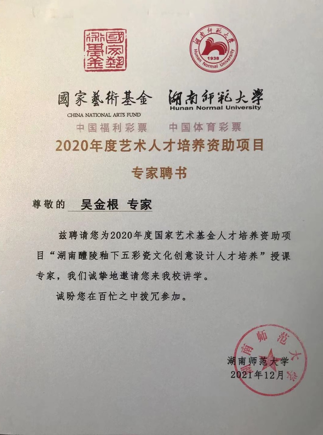 2021年3月,鉴于吴金根先生在陶瓷工艺领域的成就,特授予《中国陶瓷文化国际传播大使》荣誉称号;