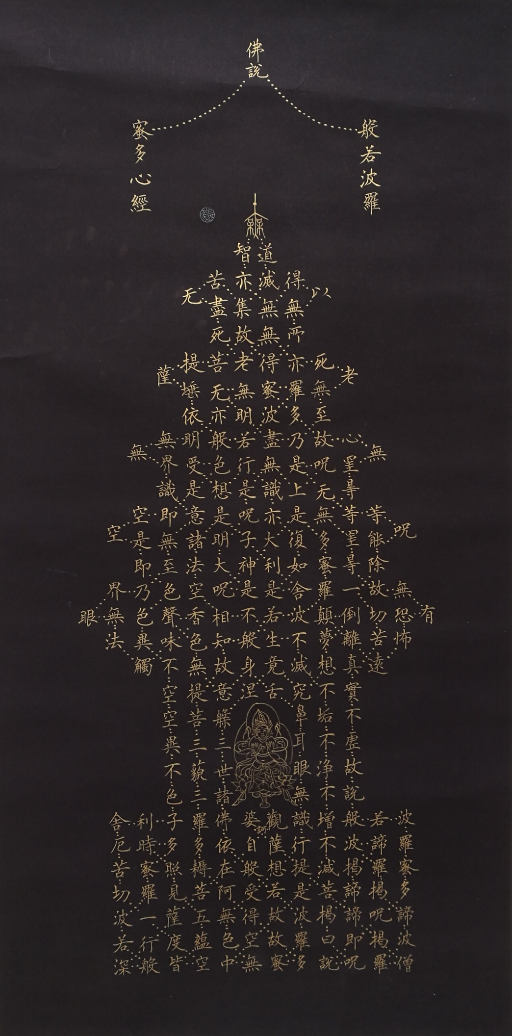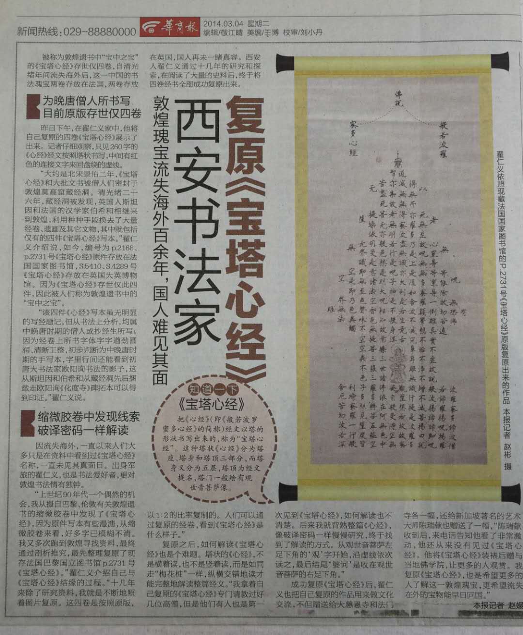 自幼爱好书法,数十年临帖不辍,广涉诸家,逐渐形成了自己的书法风格。上世纪九十年代,成功地从摄自巴黎、伦敦有关敦煌遗书的微缩胶卷中先后整理复原了四件宝塔心经写本,使这一敦煌国宝历经千年后重又和国人见面。宝塔心经即唐代敦煌高僧把《心经》以塔的形状书写出来,并由塔座、塔身和塔顶三部分组成,塔顶为经题,塔门为观世音菩萨像。解读宝塔心经的方法,是从观世音菩萨左足下角的“观”字开始,沿虚线依次读之。而这种虚线的构型又寓示了当时僧人修行的一种次第。复原的宝塔心经写本先后被大慈恩寺、法门寺和龙泉禅寺等著名寺院以及众多海内外友人收藏。宝塔心经原迹现还流失在海外,希望这一敦煌瑰宝能早日回国。