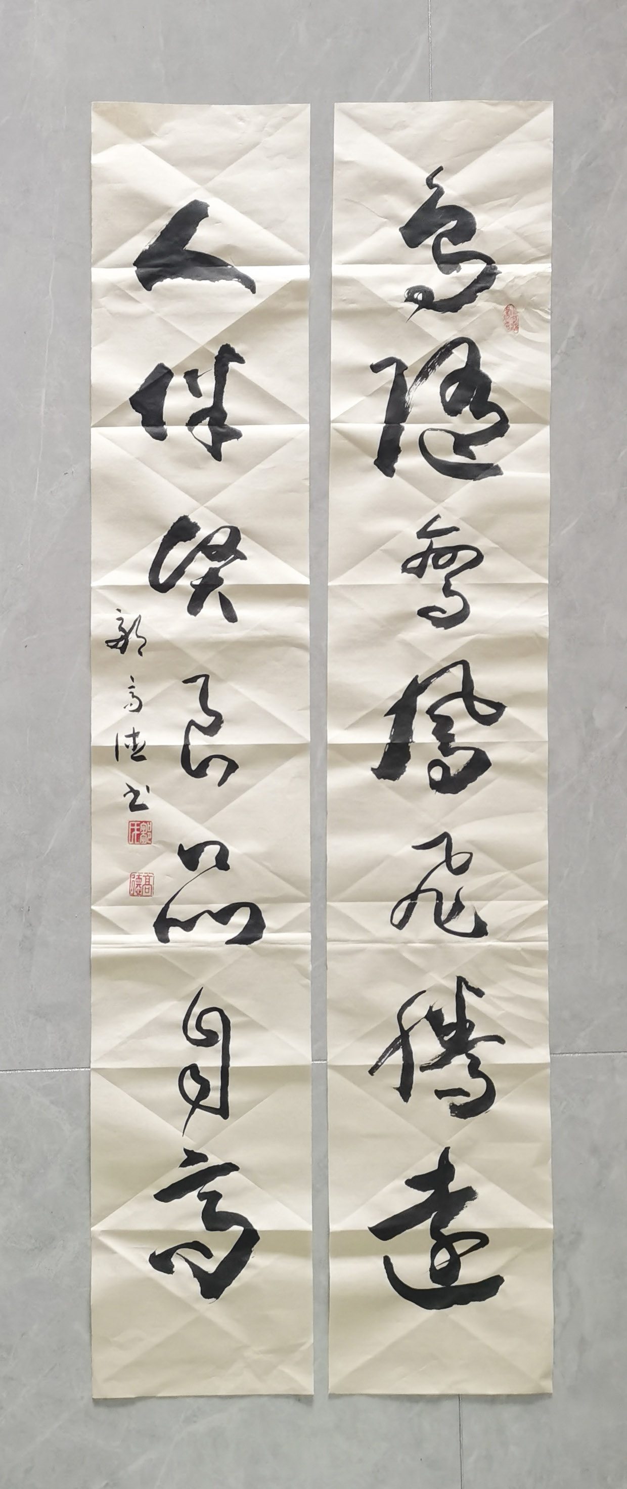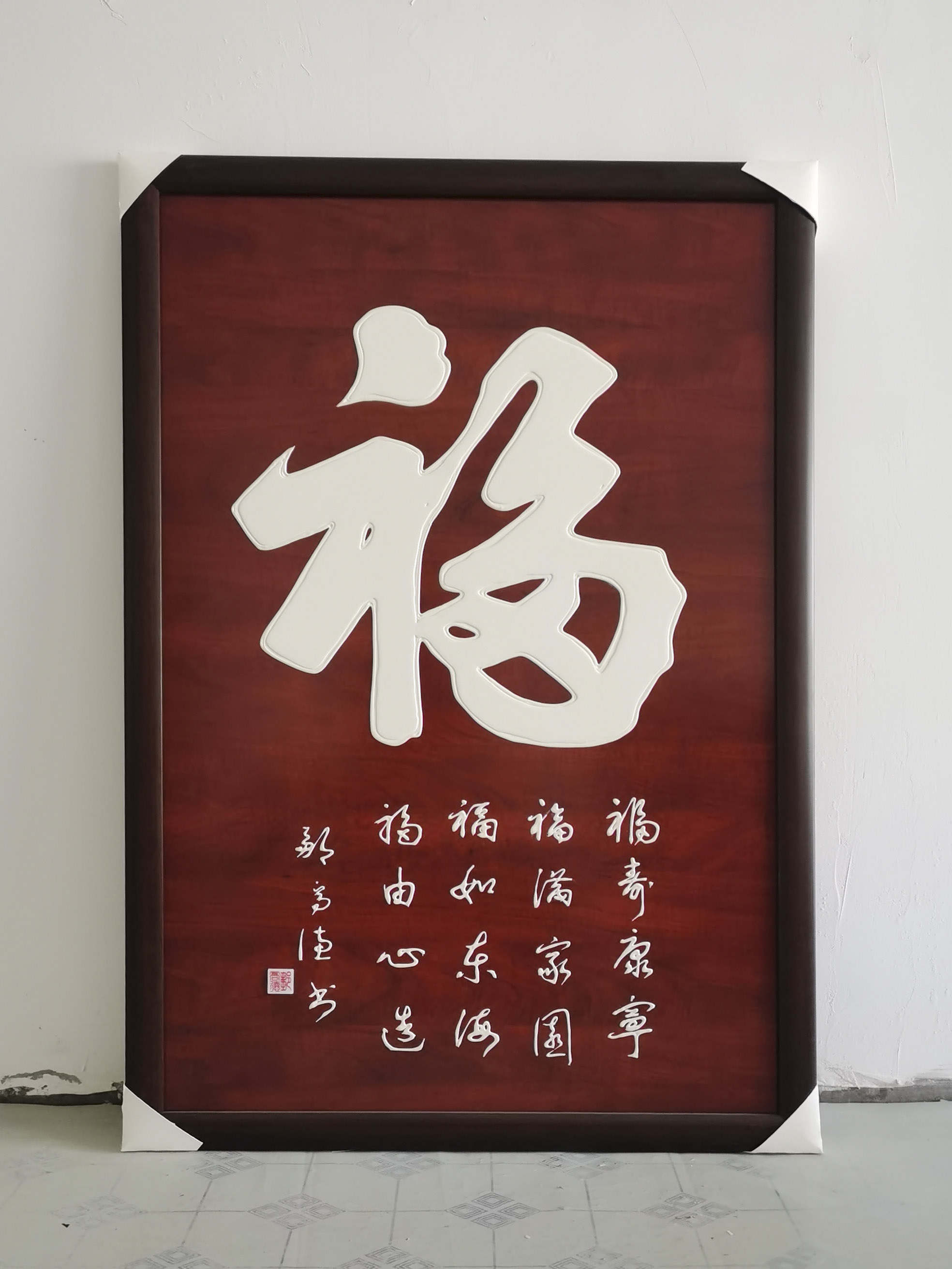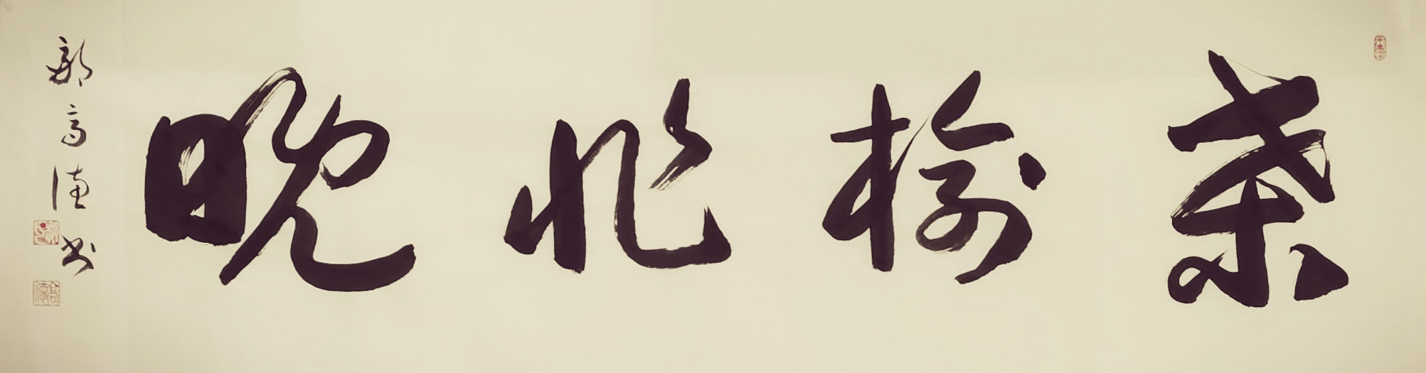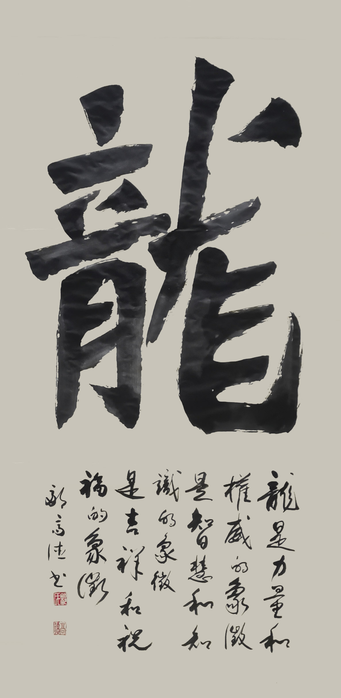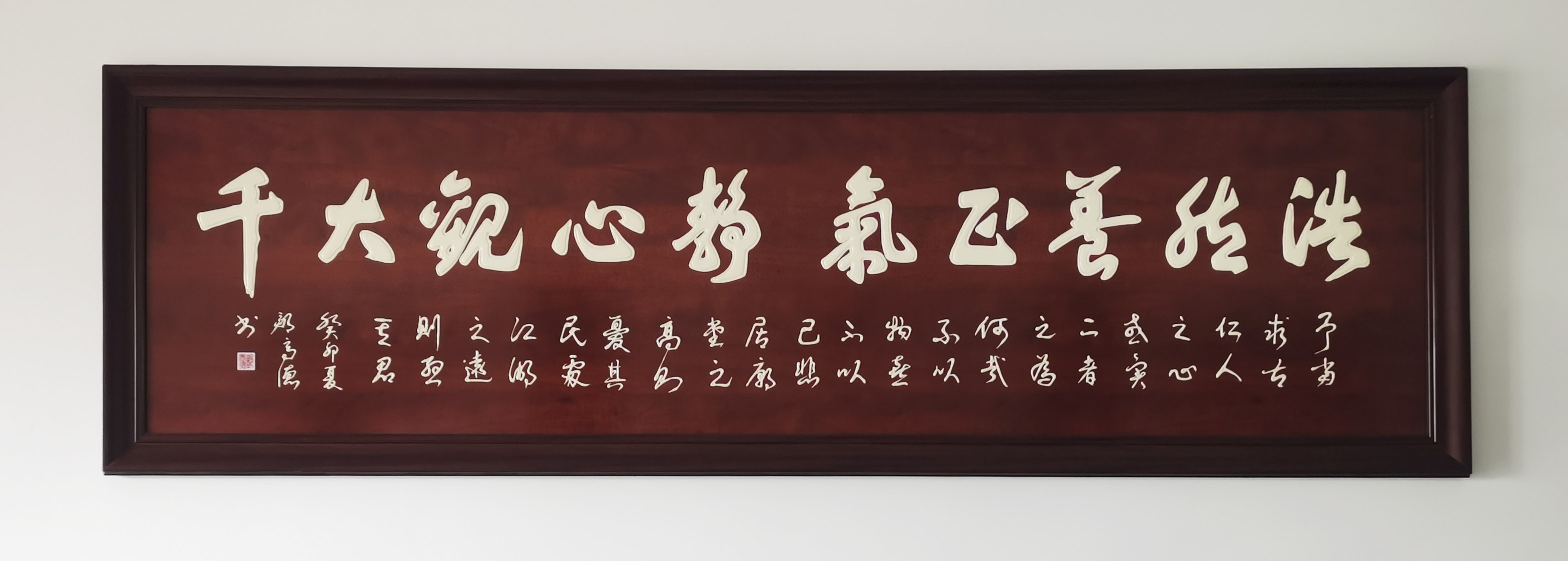 奇笔写孤标,秘膏书尘外。除了书法的形神做足了独立面目的真功夫,又知邹高德先生对书法材料进行了独家创新。传统书法以墨作汁,要的是流动性。邹高德研制了一种新型的书法膏制材料,以求书法写成立体饱满感!膏制材料之机秘,并不是人人可以驾驭的了,因为膏的粘性容易让笔毫出现滞碍,所以不解其秘,难书飞动!秘膏需有秘法,邹高德把这种膏制材料的优势发挥的无以复加,成为当代写匾额成奇观的第一笔。挂一件秘膏材料书法,可以大振心颜,犹见正大气象!一字千金,价值无量!