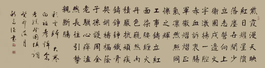 观览邹先生的书法习成宽度,可以见到各种书法形体都进行了精研覃思。篆书师法峄山碑,可以写得刚柔相济,使转自如。隶书师法十碑功,把汉家风范表现得如复旧观。楷法取颜筋柳骨,结体严谨,一丝不苟,八法之功样样精熟!当然,他的行书作品最可以见证放手写心的文人洒脱,起笔落笔可以写得成金书锦字!