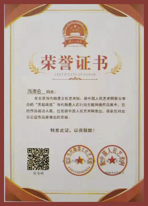 2020年作品入展北京当代翰墨文化艺术院、新中国人民艺术网联合举办的“艺起战疫”当代翰人在行动主题网络作品展。