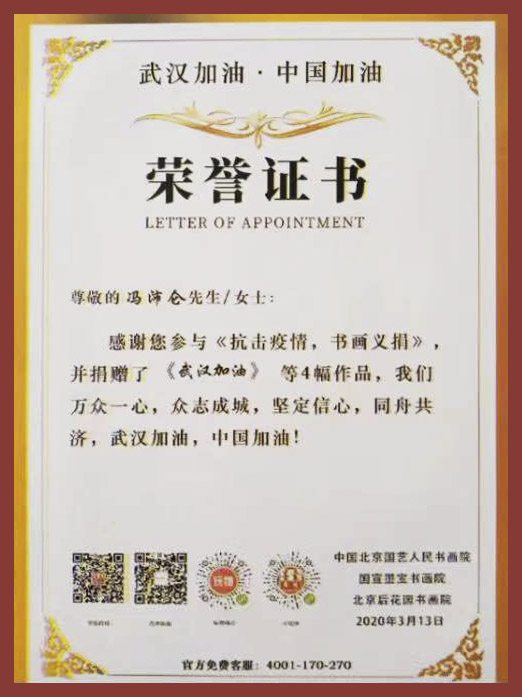 2020年在《抗击疫情,书画义明》活动中捐赠了《武汉加油》等4幅作品,为武汉加油,为中国加油。