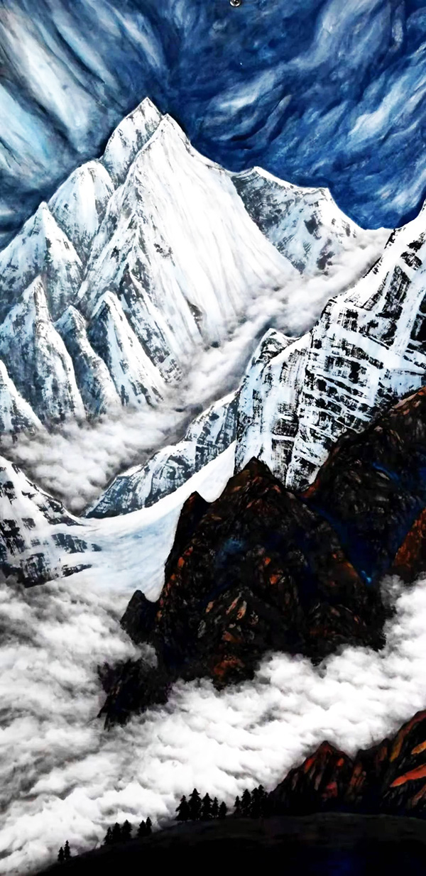 山水作品,常构宏篇巨制,构图大胆,视野开阔,摊开画卷,雄浑之势跃然纸上。气势磅礴,又带有一股灵透。既是大自然的颂歌,又是画家感情的流露,更是对人生哲理的思索。他的花鸟作品有着独特的艺术审美价值,色彩丰富,结构严谨,疏密有致,生机盎然,表现出极强的艺术感染力和生命力。
