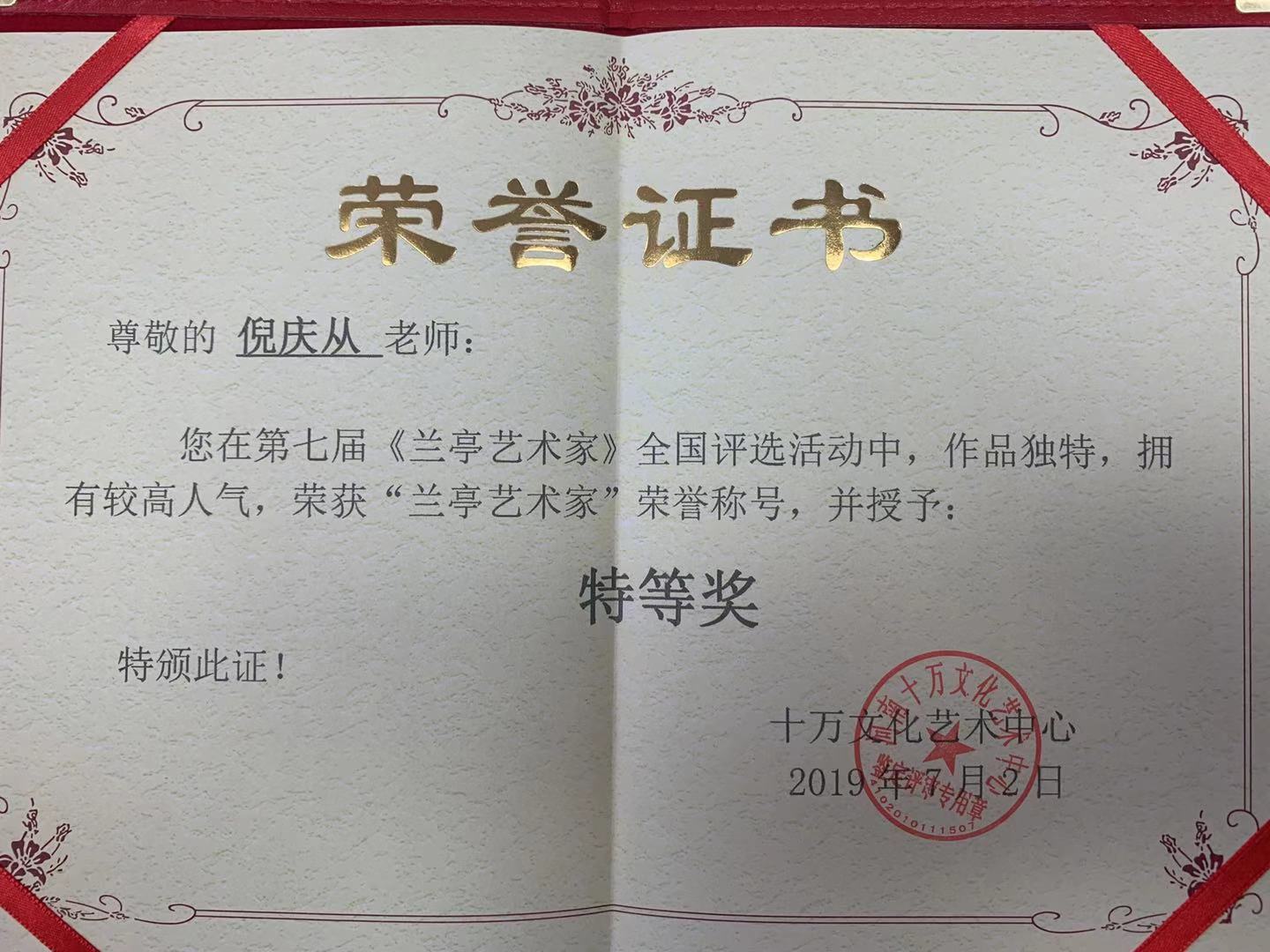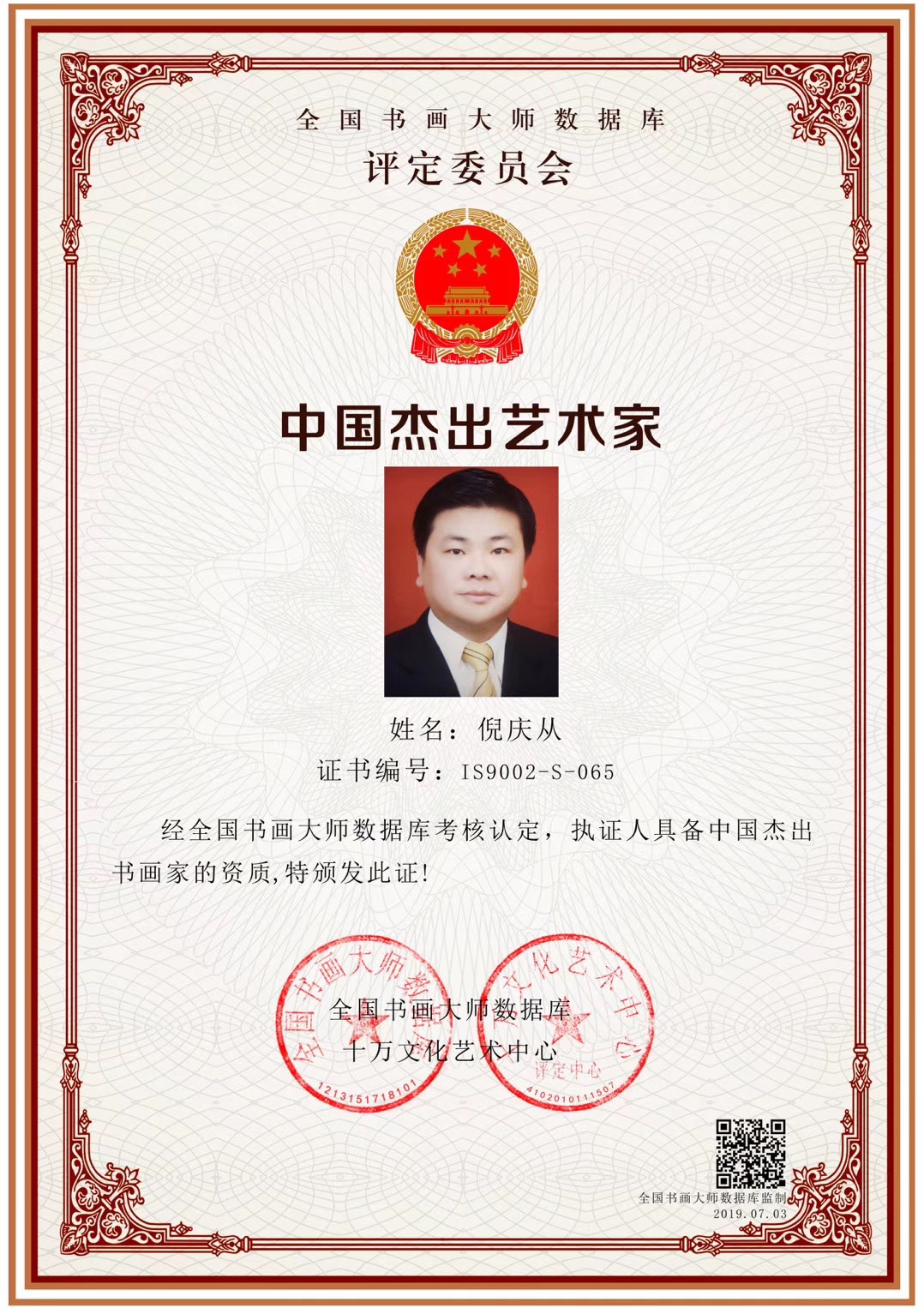 倪庆从,笔名凌云,1966年出生于浙江温州。中共党员、中共中央党校高级干部研究生班毕业、浙江省浙商经济发展理事会主席团副主席、四川省浙江商会副会长、四川航通国际物流有限公司董事长、从少喜欢书法、绘画、尤其是各种乐器爱好者。经过几十年的执着耕耘,篆刻独成风格。历年来为外藉,多年在外地创业。在各地书画家的指导帮助特别是跟世界手指画第一人,中国弘扬孝道书画院院长野石先生的教导下与治印数百方。现为四川省和河南省艺术家协会理事。作品曾在报纸,杂志多次发表。荣获改革开放40年新成就征文一等奖。四川省成都市,河南省篆刻征文活动优秀奖。2018年11月被十万艺术评选为“传世艺术家”、“2018最具投资价值艺术家”,“2019年最具投资价值艺术家”全国第七届兰亭奖第一名特殊奖、国家一级美术家,深受广大朋友们的喜欢。