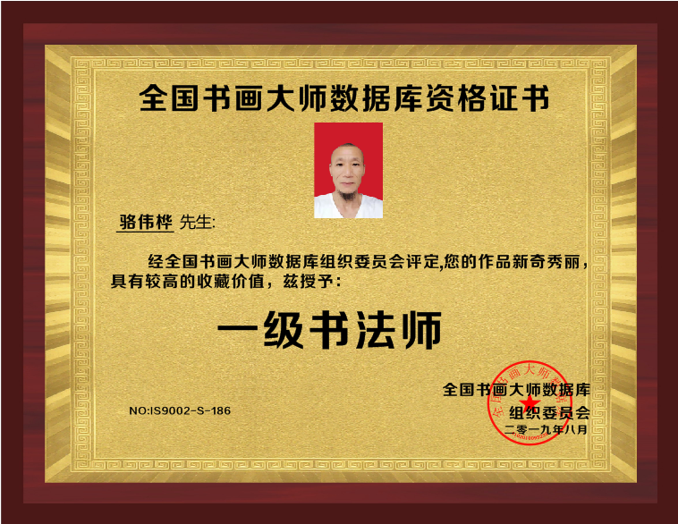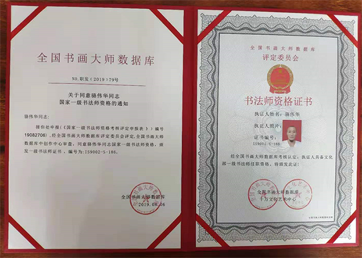 骆伟华,从小钟爱传统书画艺术,幼年时学习书法隶书,后有痴迷兰亭序,多寳塔和赵孟頫的作品等。曾向现国内多位实力派老师请教与交流,受益匪浅,经不断地演练,终成自己的风格,师古创新,找到本我是幸福的,。经多年的积累,在2018年,参赛寻找民间书画艺术高手,得了三等奖,后又参加,我为艺术代言,庆祝改革开放40周年,有幸得了特等奖,后又参与黄河书画大赛获奖三等奖,等等,现自创办(太极书法禅)工作室。2019年作品在第一届“神州杯”中华诗词大赛中获得优秀奖。2019年在文化艺术创作中表现突出,获得“全国年度艺术模范人物”荣誉称号。2019年经全国书画大师数据库颁发“一级书法师“称号。2019年获得“国礼艺术家”称号。