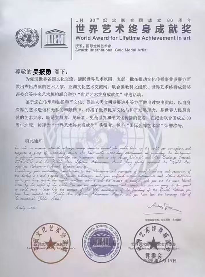 2025年4月荣获“世界艺术终身成就奖”,被授予“国际金牌艺术家”称号;