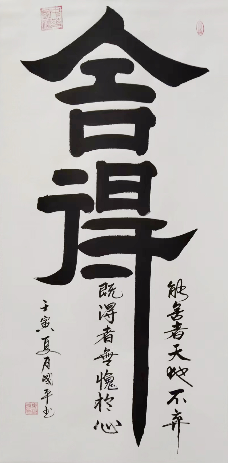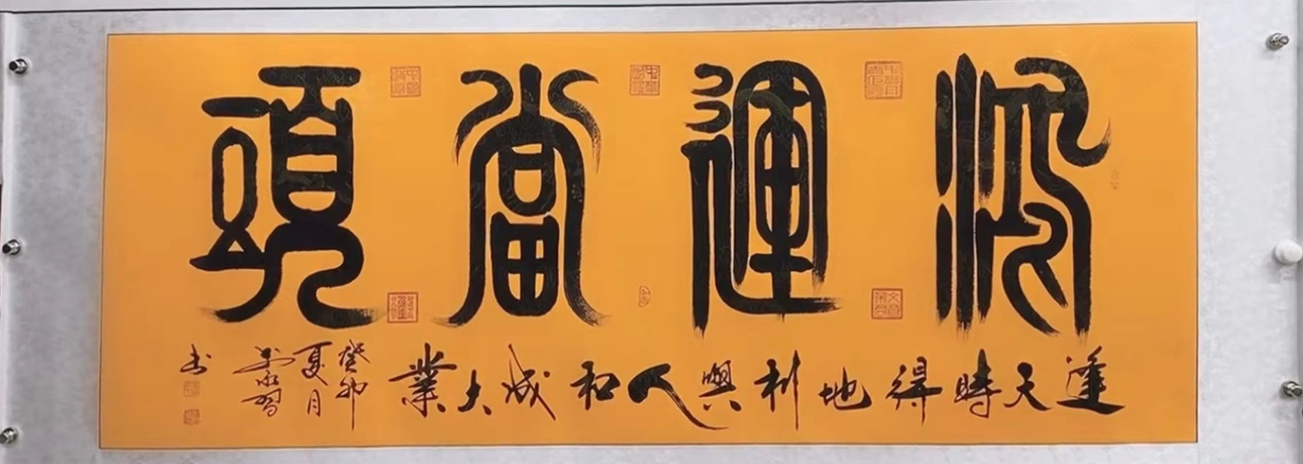 第二版组合字《天地人和》在全国百杰艺术书法展会上,又获得金奖,被著名央视主持人,赵忠祥以四十二万收藏,挂在家中,