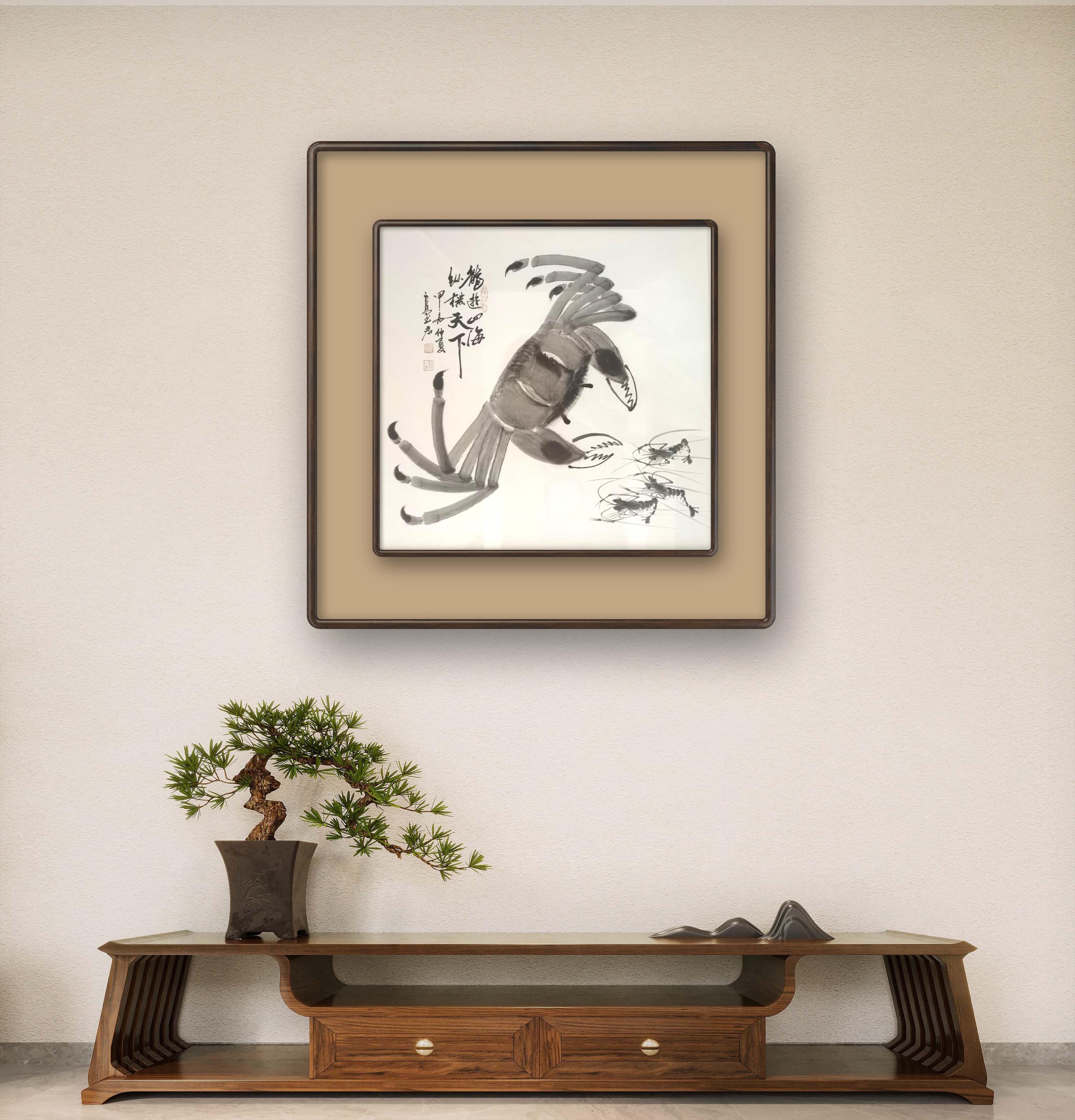 山水画,融北派之雄浑与南派之灵秀,构图疏密有致,笔墨苍润相济。花鸟虾蟹画,承齐白石“红花墨叶”技法,写意形神兼备,赋色明快鲜活。