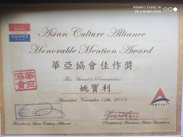 2015年10月份荣获在美国举办的亚洲第一届艺术节书画展其作品获得佳作奖(最高奖);