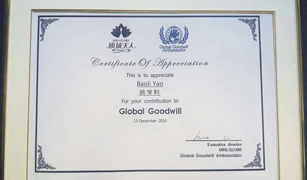 2016年12月13日被邀请在北京参加联合国妇女署暨环球夫人亲善大使慈善晚会,并获得联合国妇女署颁发的特别贡献奖;