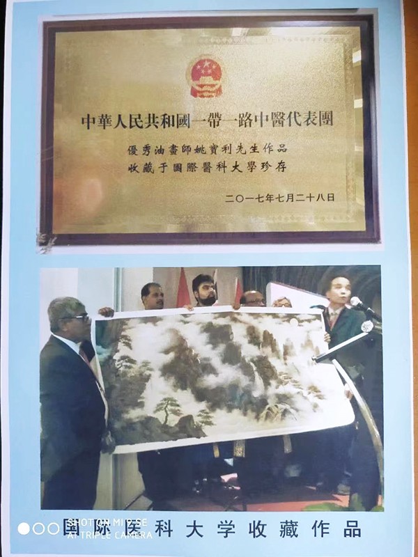 2017年7月28日中华人民共和国一带一路中医代表团用我的作品作为国礼赠送给国际医科大学 ,由此国际中医大学特颁发收藏牌匾证书;