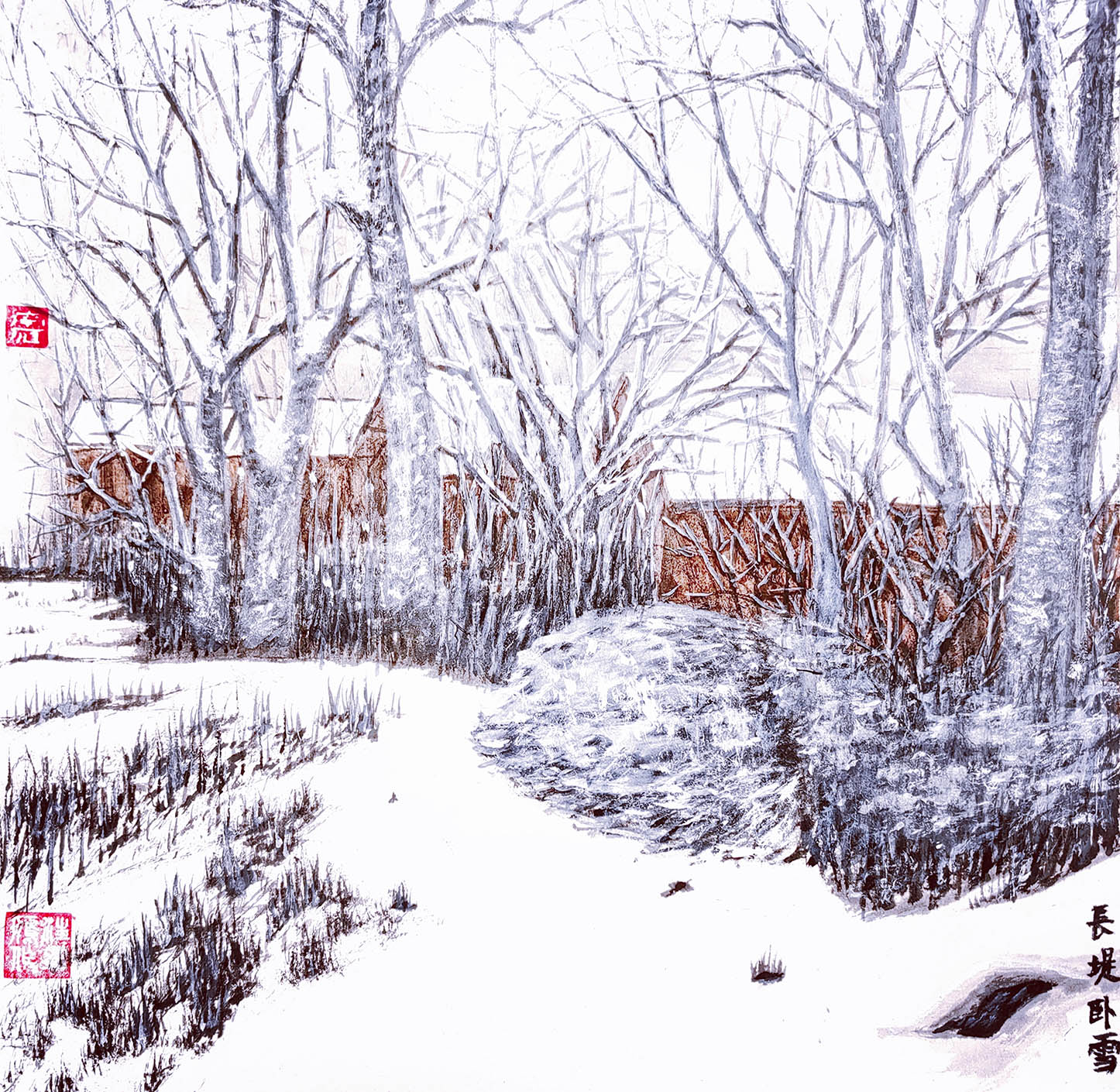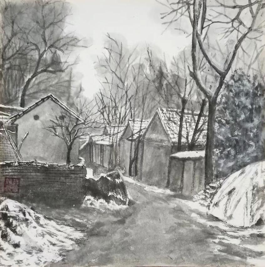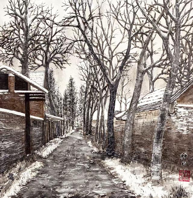 汪章雁的创作始终以“师法自然”为精神根基,延续中国山水画“外师造化,中得心源”的传统内核,同时以开放姿态吸收西方风景写生的空间建构逻辑与质感表现方法 。在题材选择上,他跳出传统文人画的程式化藩篱,将日常生活场景、物象作为叙事主体,如《腊月柴门待归人》中朴实的农家,《故里一角》雪中的巷径,《村口》冬日里坚毅的树干和凛冽的寒枝,风雪中村外长堤,这些极具生活温度的日常景观,都化成其传递人文关怀的载体 。