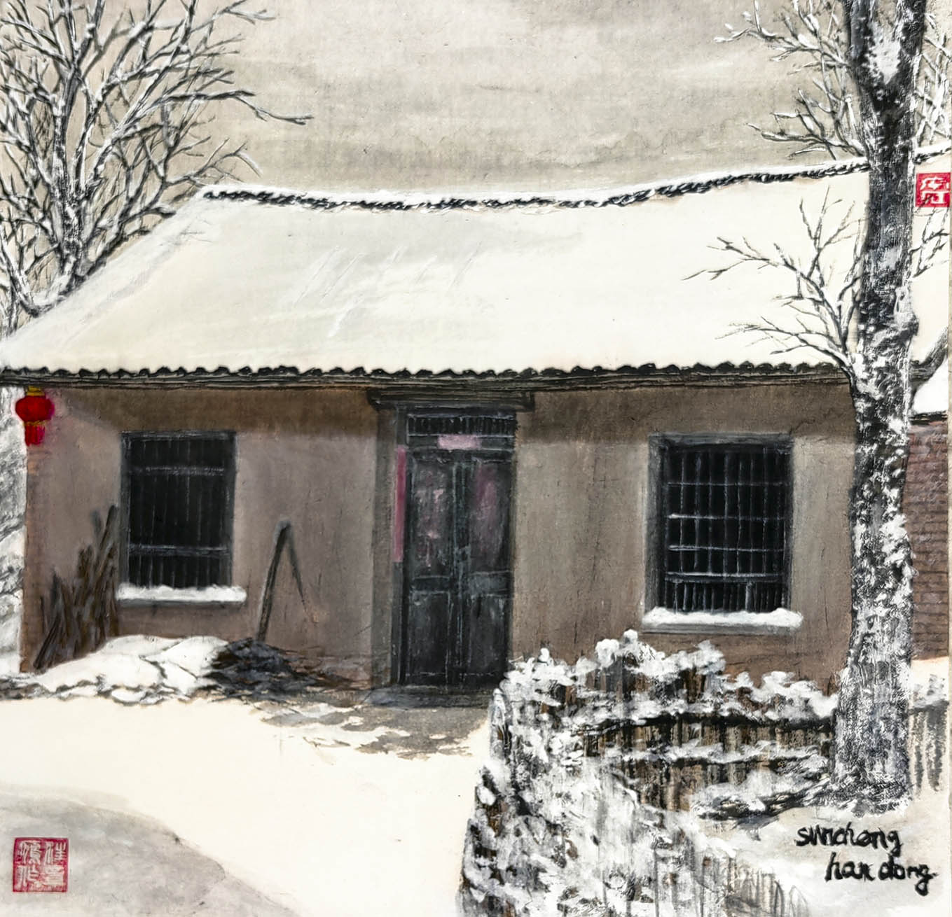 乡土题材是汪章雁艺术创作的核心板块,也是其情感寄托的重要载体。《故里冬日》《腊月柴门待归人》《祖乡村广场》《诗意徽乡》等经典作品中,他用平常笔墨勾勒出故乡的宁静与温情,冬日村舍、腊月柴门、祖乡广场,每一处景致都承载着浓烈乡愁,写绘的不只是故乡的外在风貌,更是骨血里的眷恋与牵挂。他用最平实的艺术语言,将乡村文化传承的执着和故土家园的热爱融入笔端,让作品充满情感温度,成为引发观者情感共鸣的泉源,也让中国水墨画在当代焕发出别样的生命力。
