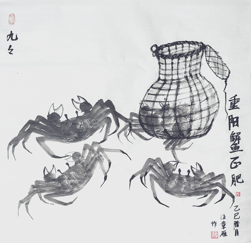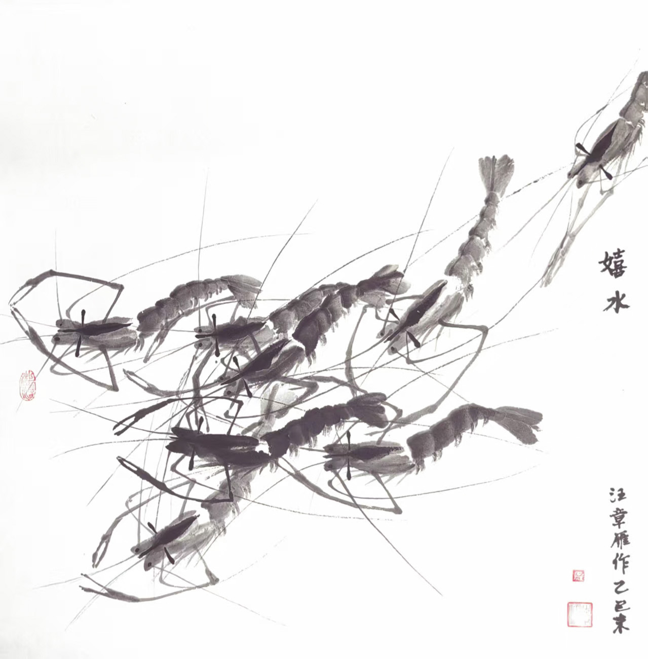 除了风景写生水墨的深厚造诣,汪章雁在水墨虾蟹题材创作上亦有独到建树,师法传统而自出新意。他坚守“师古人更师造化”的理念,深入自然观察水族生灵的动态神情,以中锋运笔、以书入画,用凝练清雅的笔墨,绘出虾之灵动通透、蟹之苍润厚重。笔下之虾,水墨淡雅、气韵生动,虾须柔中见劲、摇曳生风,仿若清水涌动,群虾相呼相应、悠然自得;笔下之蟹,墨色厚重,朴拙有趣;群虾组蟹,或并肩同游、或首尾相顾、或穿插避让,错落天成,尽显水族本能的动、静、聚、散之美态,暗合“和谐共生”的生态哲思。他的水墨虾蟹作品笔墨简练、灵动自然、极富生命活力,是传统花鸟写意在当代的鲜活延续与个性表达。