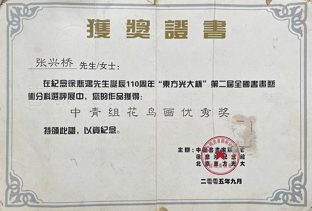 2005年9月,纪念徐悲鸿诞辰110周年“东方光大杯”第二届全国书画艺术选评展获得”优秀奖“。
