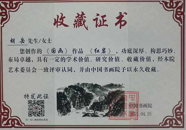 2021年4月,胡岳老师创作的国画作品《红岩》被中国书画院收藏,并被吸收为中国书画院院士。
