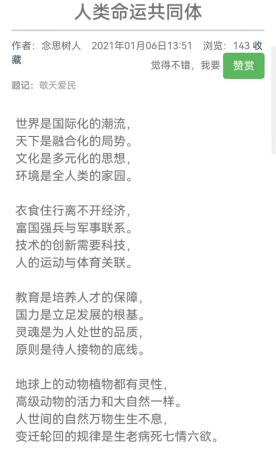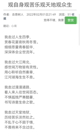 徐嘉康,男(2001—)字堂铭,笔名念思树人,思念树人。安徽省枞阳县人。专业知识是汉语言文学。热爱至深文学艺术琴棋书画,对散文诗歌情有独钟,写有大量古风诗词、现代诗文和感悟以及短篇故事。作者简介在『中国作家网』平台,诗文作品在『中国诗歌网』『诗歌圈』『品诗』『青柚读书会』『清枫诗文』《青春的散文诗》《诗海寻梦》等发表。著有《万字情书》在香江出版社发行,写有《徐嘉康大全集》三卷,现在是中国先锋文艺作家协会网站管理员,中国诗歌圈官网执行副主编。先后荣获诗人乐园文学奖,人人文学网诗歌奖,传世艺术家网中华艺术人物奖,中诗网作家网最佳图书最佳编辑奖。参加过央视2022年中国诗词大会栏目第七季千人团答题比赛并录制视频。