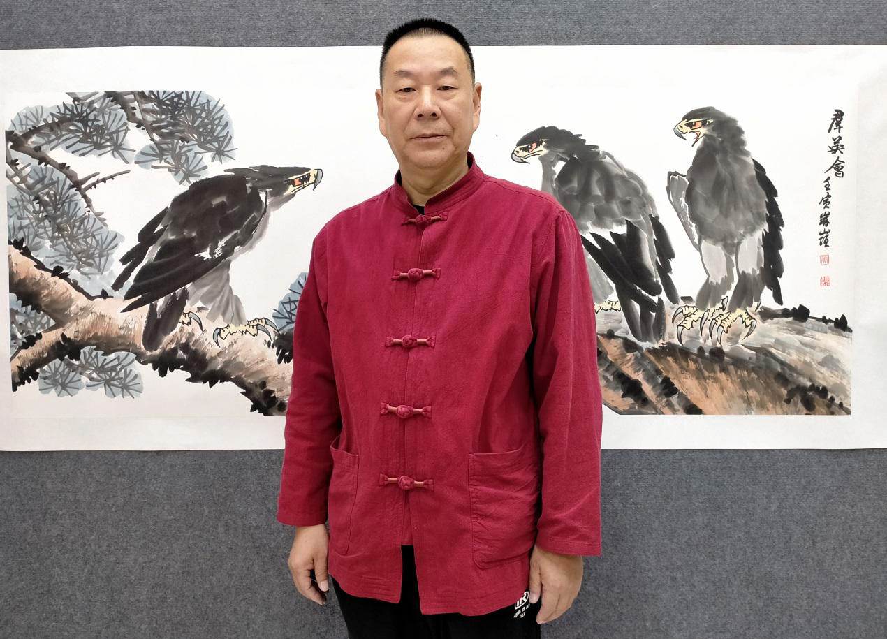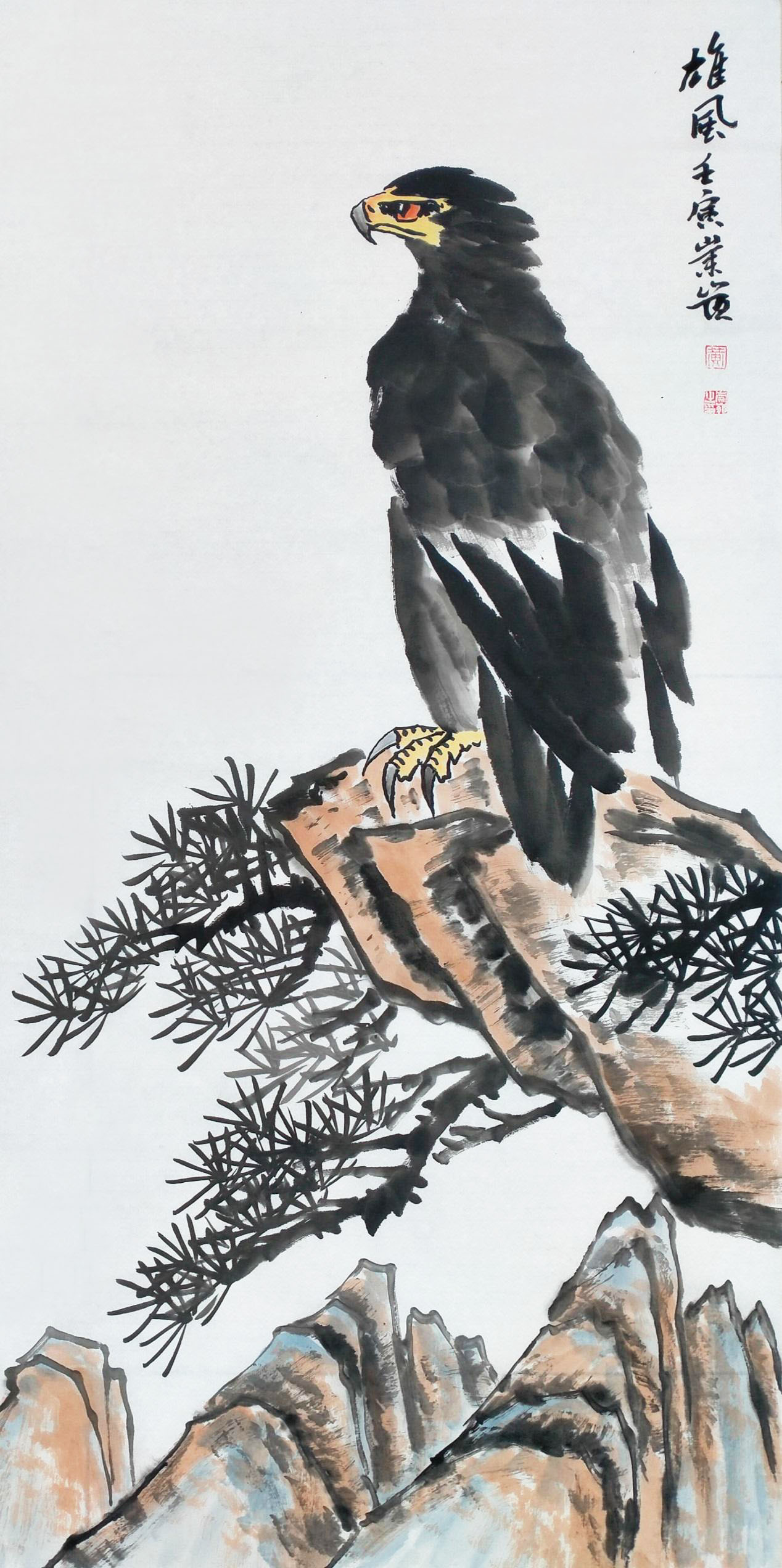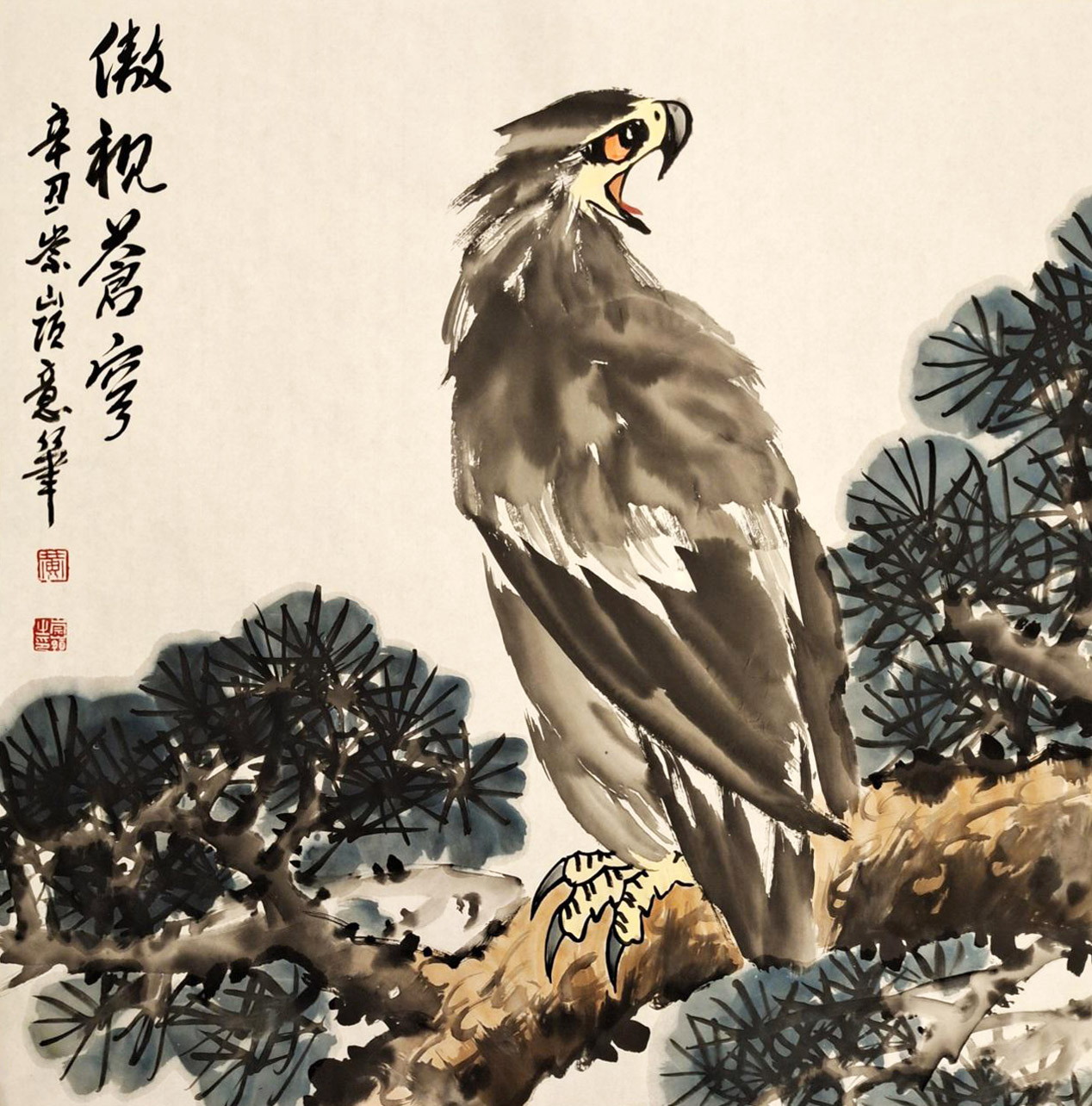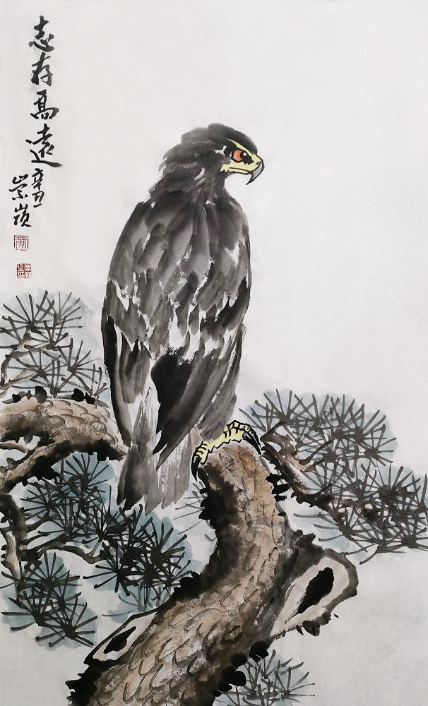 当代实力派画家崇嶺先生的大写意老鹰可称得上是其花鸟画中的代表,用大泼墨法挥写翅羽,用笔相当豪放劲爽,鹰的头部采用严谨的写实技法,尤其鹰眼采用多层染色显得目光炯炯。