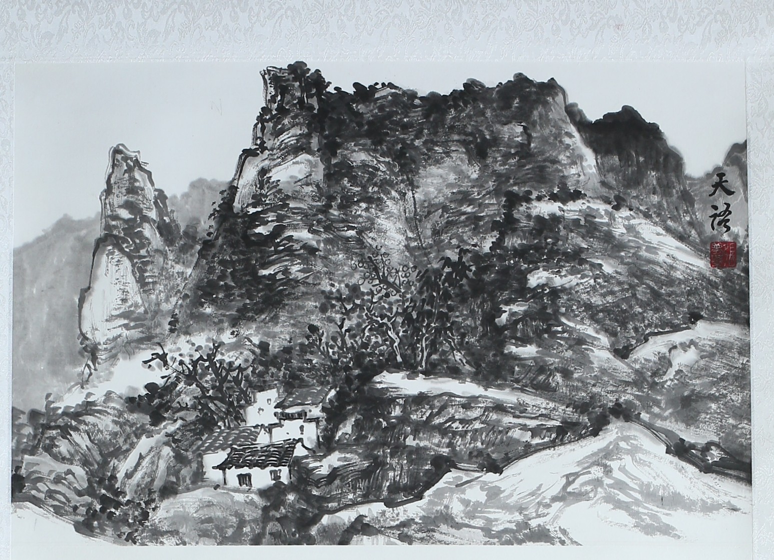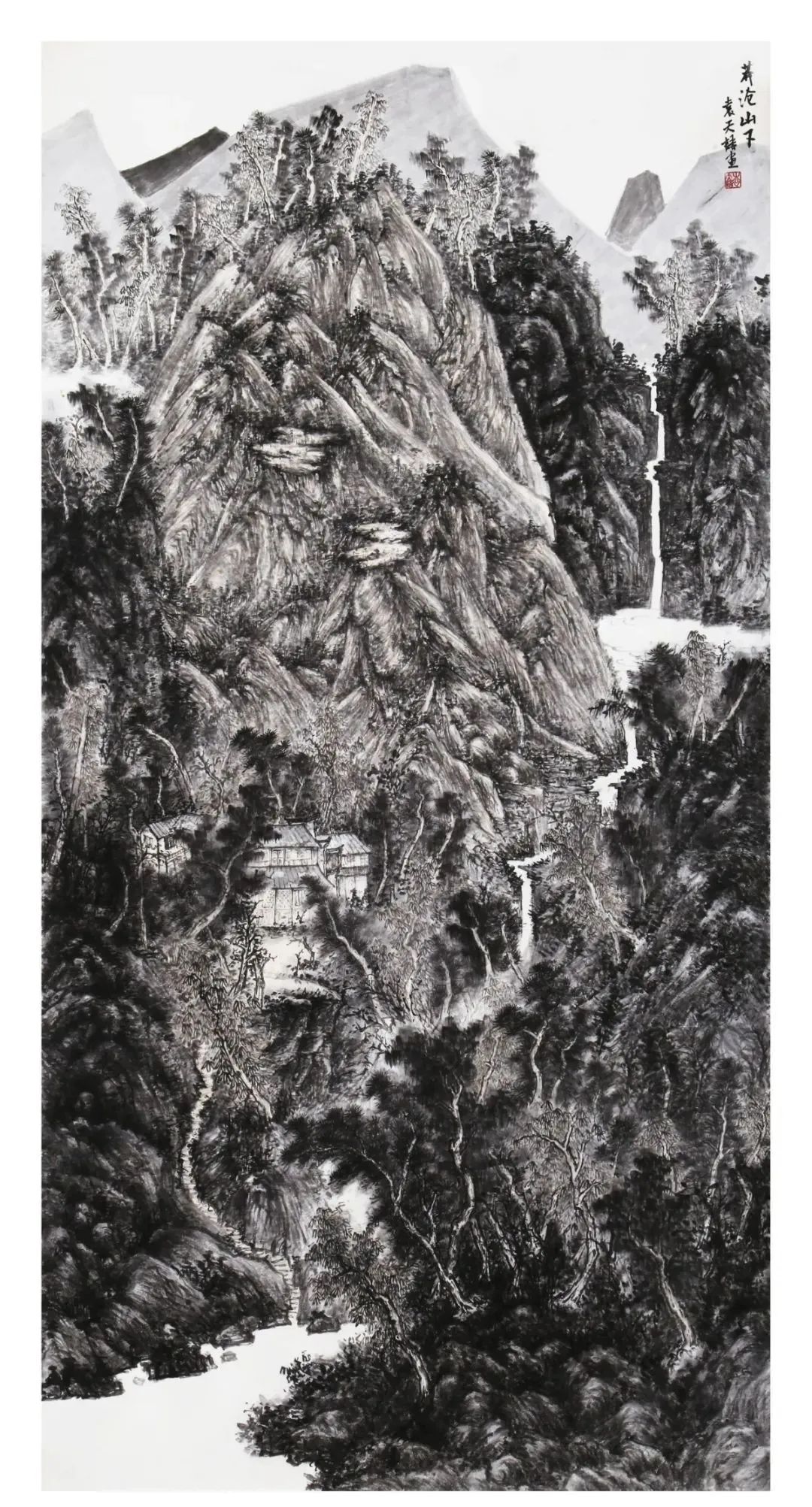 相同的笔法意识也是有体现在青年画家袁天语的众幅山水画作中,其众幅山水画作虽是持以写意法脉,但从笔墨的呈现上来看,其还是可察循以深厚的立骨精神,行笔收笔,既不是故作迷离,也不是生硬唐突,而是唯任以行云流水质感,由是笔墨相映,自在天成!通幅山水形意,也是有随笔墨而生气象,远近可品变化,浓淡可浸浑然,如此山水妙境,实无愧如象外之味也!