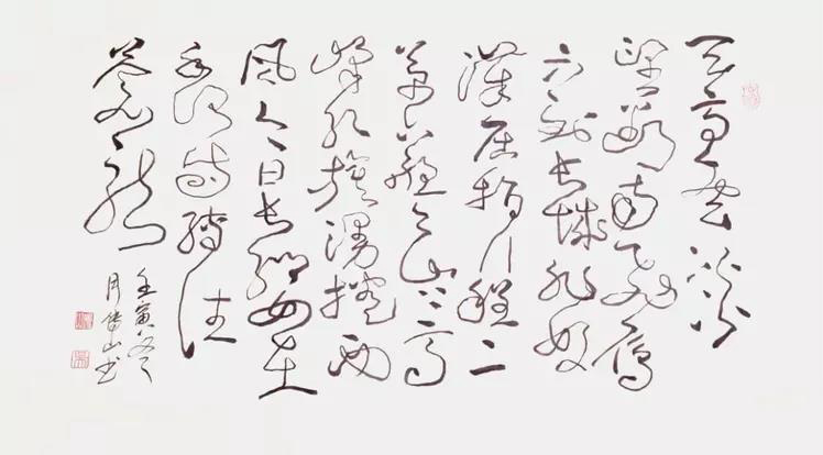 在吴传山的草书作品里游目骋怀,足以极视听之愉。他用笔墨千变万化的力度和速度,合成书法生动有趣的节奏动感。快笔落墨,笔走纸响,须臾扫尽数千张,写下飘风骤雨惊竦竦的笔墨奇观。慢笔漫涩,凌空杀纸,复如惊蛇之透水,写成落花飞雪何茫茫的书法诗意。大笔一挥力达千钧,轻笔回转牵丝映带。经由节奏的铺陈,吴传山的书法印象就有类万物之象的无限精彩,既有孤蓬自振的奋力搏击,也有座沙惊飞的山水风吟。一件件看过吴传山的书法作品,必有这样的体验:书法渊妙亘古相续,笔墨传奇代不绝人。