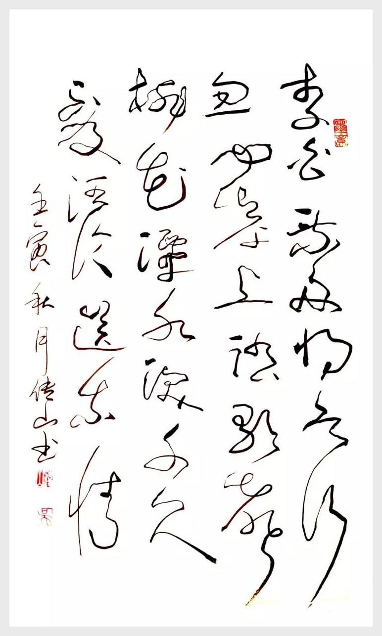 由他的隶书作品,走进他创作的草书作品,顿时可见铁点银钩的风骨经营。以钢打铁铸一般的笔力,塑造出书法线条的寒寂劲硬,字字如凌冬枯树。书法自古瘦硬显精神,吴传山可谓是深谙书道真谛,可以执笔杀尽中山兔,亦能墨池飞出北溟鱼!赵子昂有书论言,结字因时而转,用笔千古不易。吴传山一边心追手临历代碑帖,一边深刻觉悟千古书论,理论与实践双重并进,这是他特别重视书法线条塑造效果的重要原因。