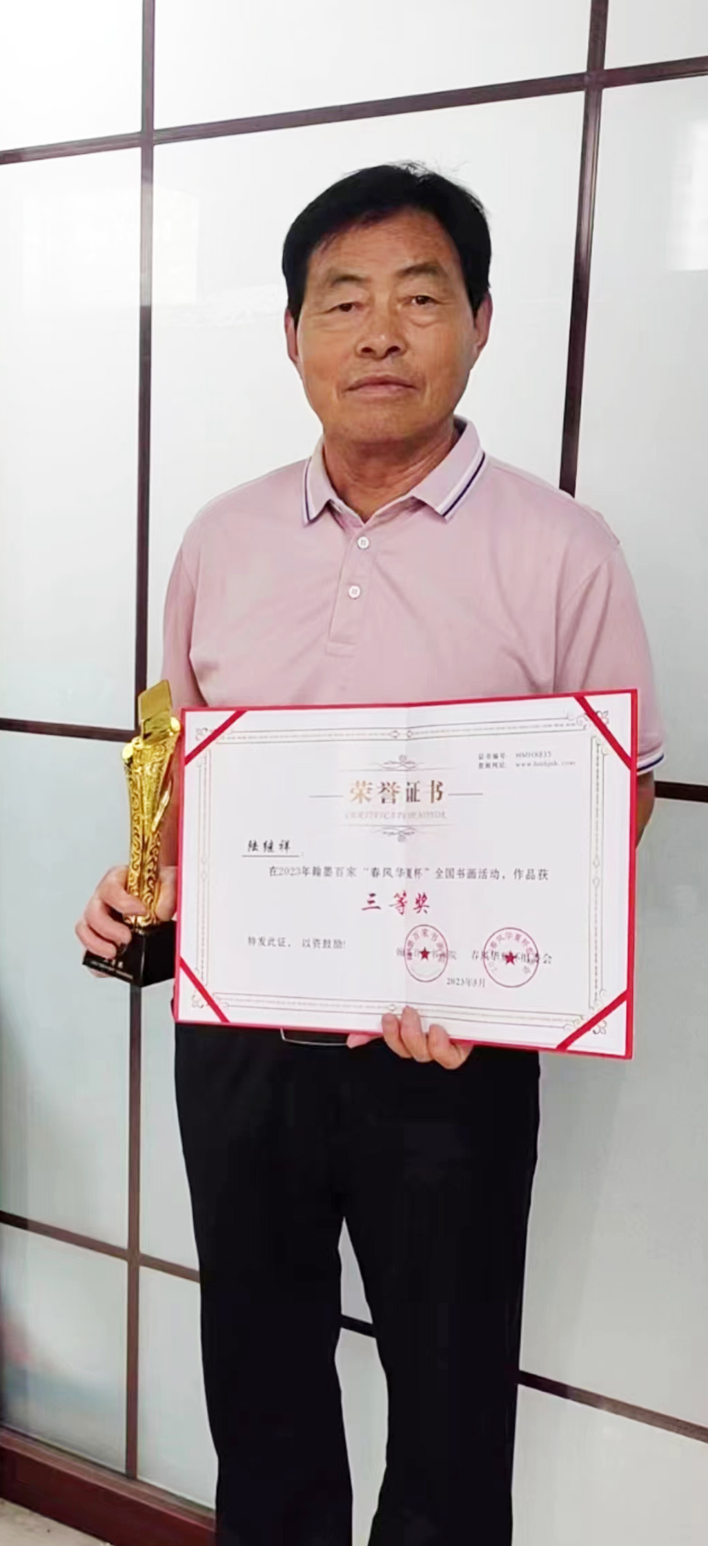 在2016年宿州市举行的图土资源杯书法大赛中获二等奖,2023年5月在翰墨百家,春风华夏杯,全国书画活动中获三等奖。作品曾多次参加国家及各省市大展并获金奖,并多次被做为国礼赠予外国驻华大使及国际商业精英,深受各界人士的喜爱和收藏。