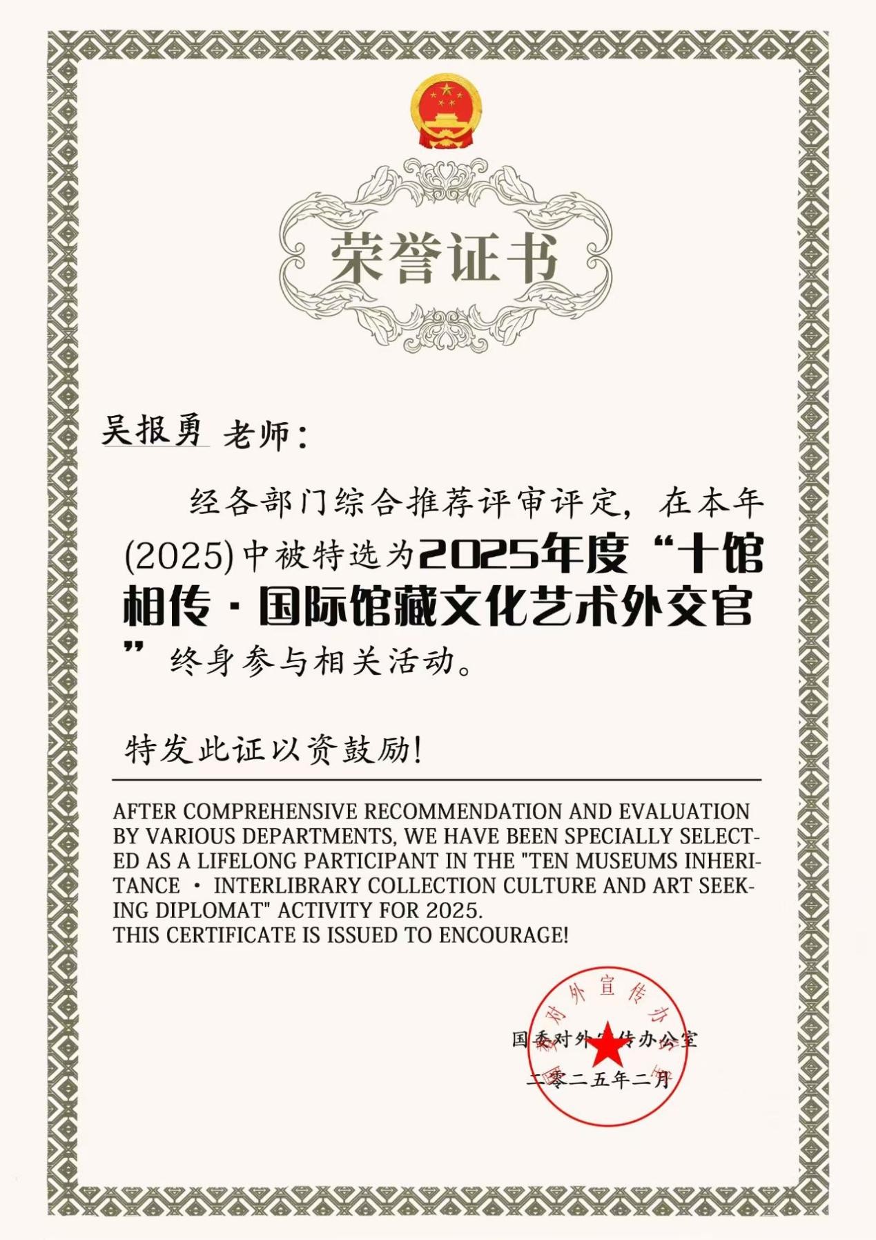 2025年2月荣获国委对外宣传办公室特评定为2025年度“十馆相传—国际馆藏文化艺术外交官”、“国际馆藏艺术家”,终身参加相关活动;