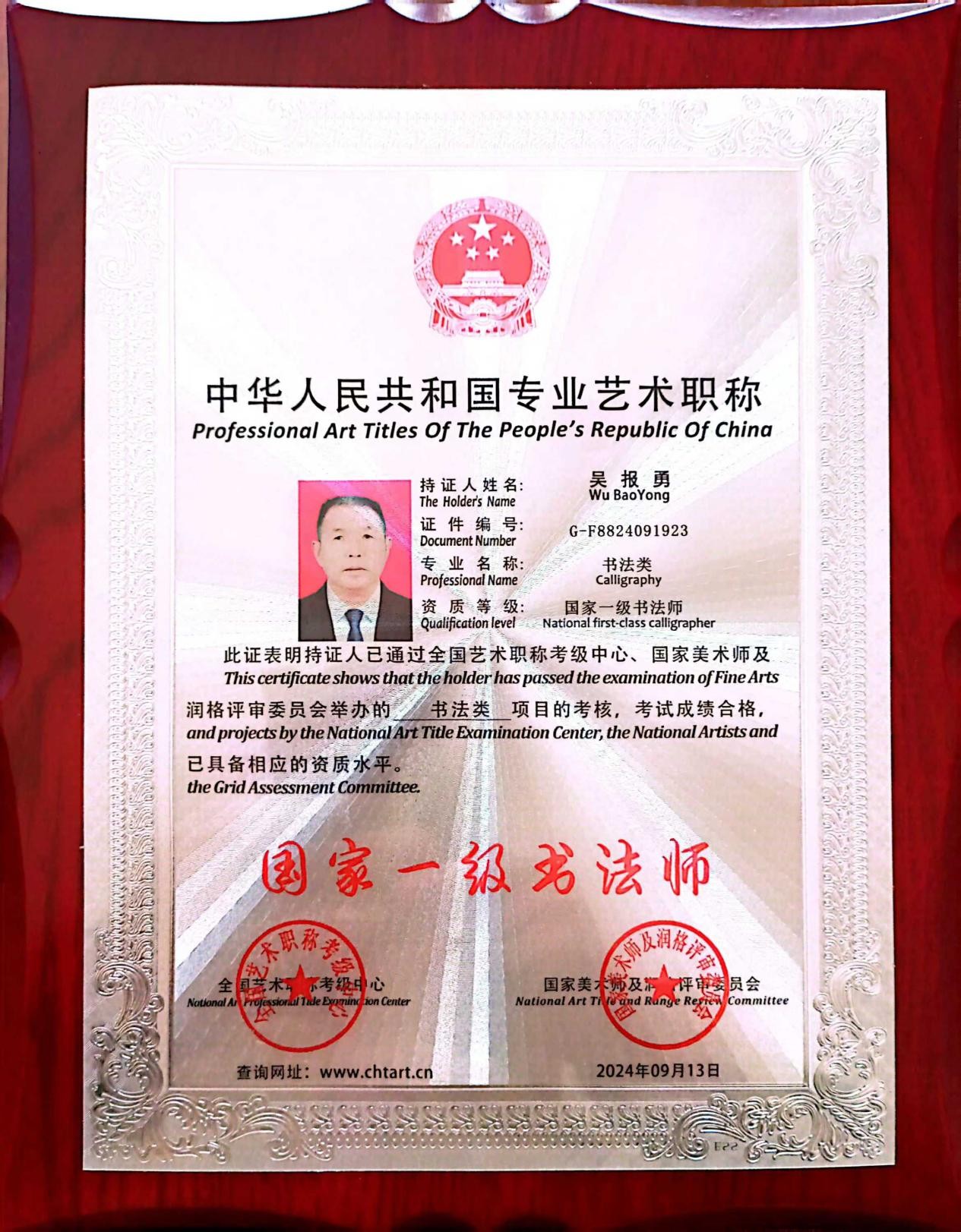 2024年9月被中华人民共和国专业艺术职称考级中心考核授予“国家一级书法师”证件编号G-F8824091923;