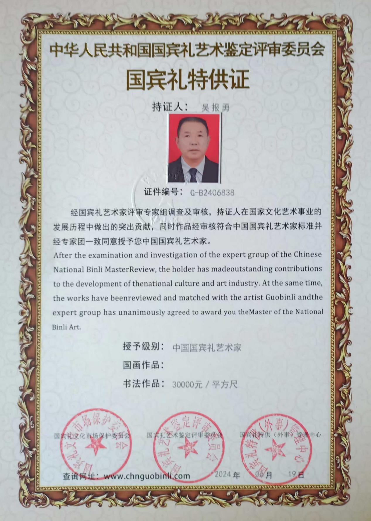2024年6月由国宾礼艺术家评审专家授予“中国国宾礼艺术家”,由中国国宾礼艺术鉴定评审委员会、国宾礼文化市场保护委员会、国宾礼特供(外事)管理中心颁发国宾礼特供证书(编号G-B2406838)、评估证书、作品《上善若水》作为中华人民共和国国宾礼收藏、《志博云天》获得中华人民共和国国宾礼鉴定证书;