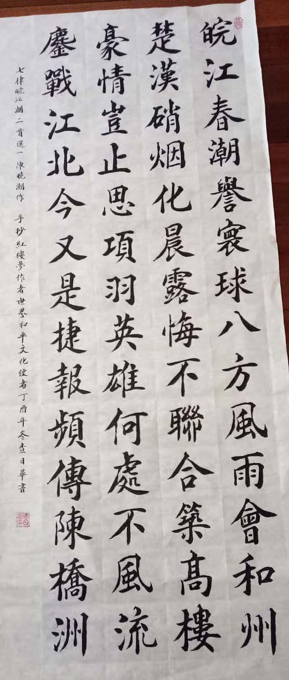 查日华,1944年12月,出生于安徽铜陵。查日华先生以楷书见长,同时擅长书写行、隶、篆、草、魏碑等,能以非笔具书写、双手同书、交叉书写、左笔书写、气功口含笔书写,尤其是独创的隶、魏、行三划一体书法,独辟蹊径,自成一派,令人耳目一新,享誉国内外。